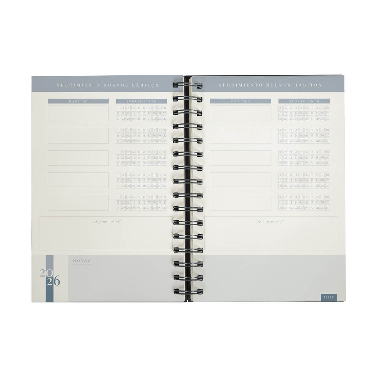 Agenda diaria con 174 hojas. Contiene datos personales, calendarios 2025-2026-2027, planeador 2026, seguimiento de nuevos hábitos y días festivos. Incluye bolígrafo metálico y caja individual tipo regalo.