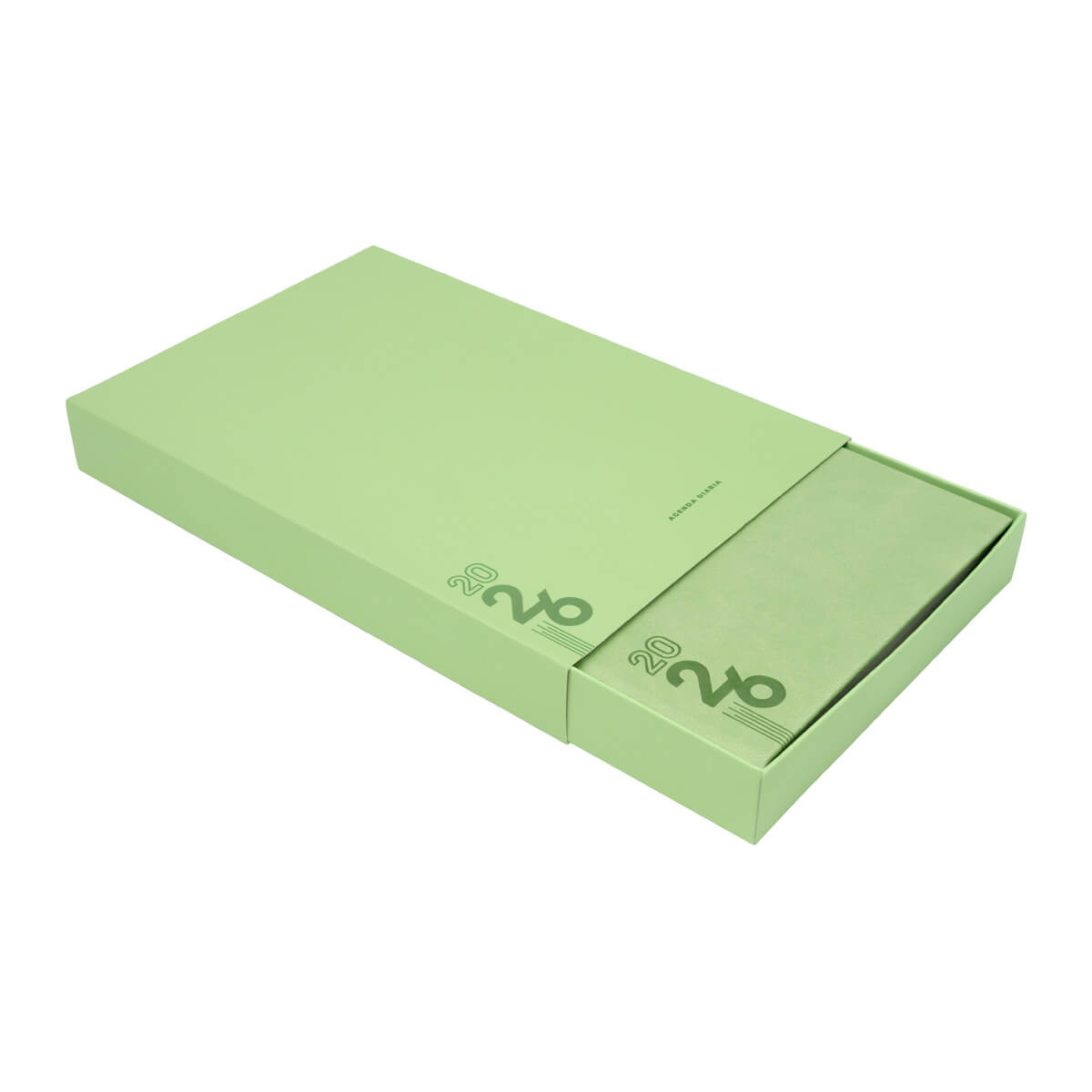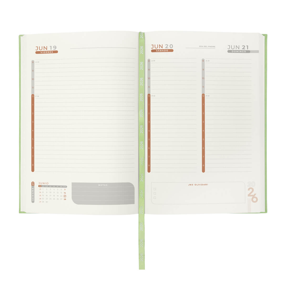 Agenda diaria con 186 hojas. Contiene datos personales, calendarios 2025-2026-2027, planeador 2026, seguimiento de nuevos hábitos, organizador de tareas, planeador de proyectos y días festivos. Incluye caja individual del mismo color a la agenda.