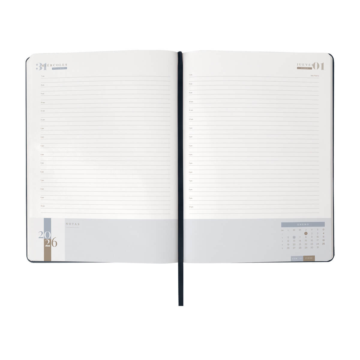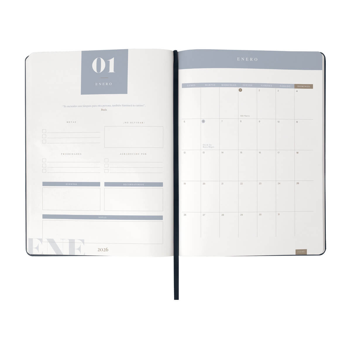 Agenda diaria con 174 hojas. Contiene datos personales, calendarios 2025-2026-2027, planeador 2026, seguimiento de nuevos hábitos y días festivos. Incluye caja individual.
