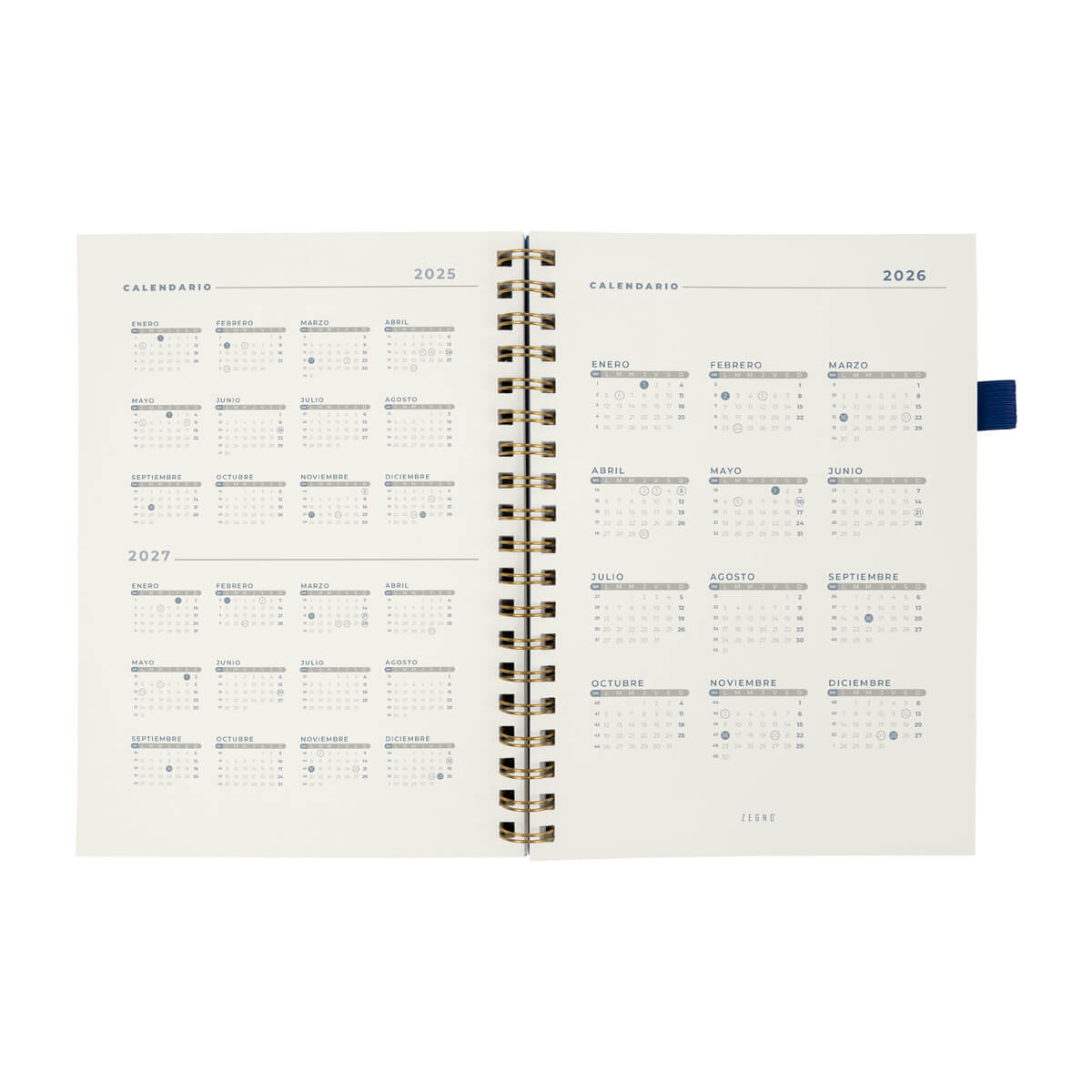 Agenda semanal con 80 hojas. Contiene datos personales, calendarios 2025-2026-2027, planeador 2026, seguimiento de nuevos hábitos, organizador de tareas, planeador de proyectos y días festivos. Incluye caja individual del mismo color a la agenda y bolígrafo.
