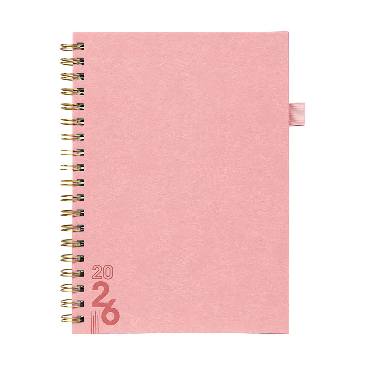 Agenda semanal con 80 hojas. Contiene datos personales, calendarios 2025-2026-2027, planeador 2026, seguimiento de nuevos hábitos, organizador de tareas, planeador de proyectos y días festivos. Incluye caja individual del mismo color a la agenda y bolígrafo.