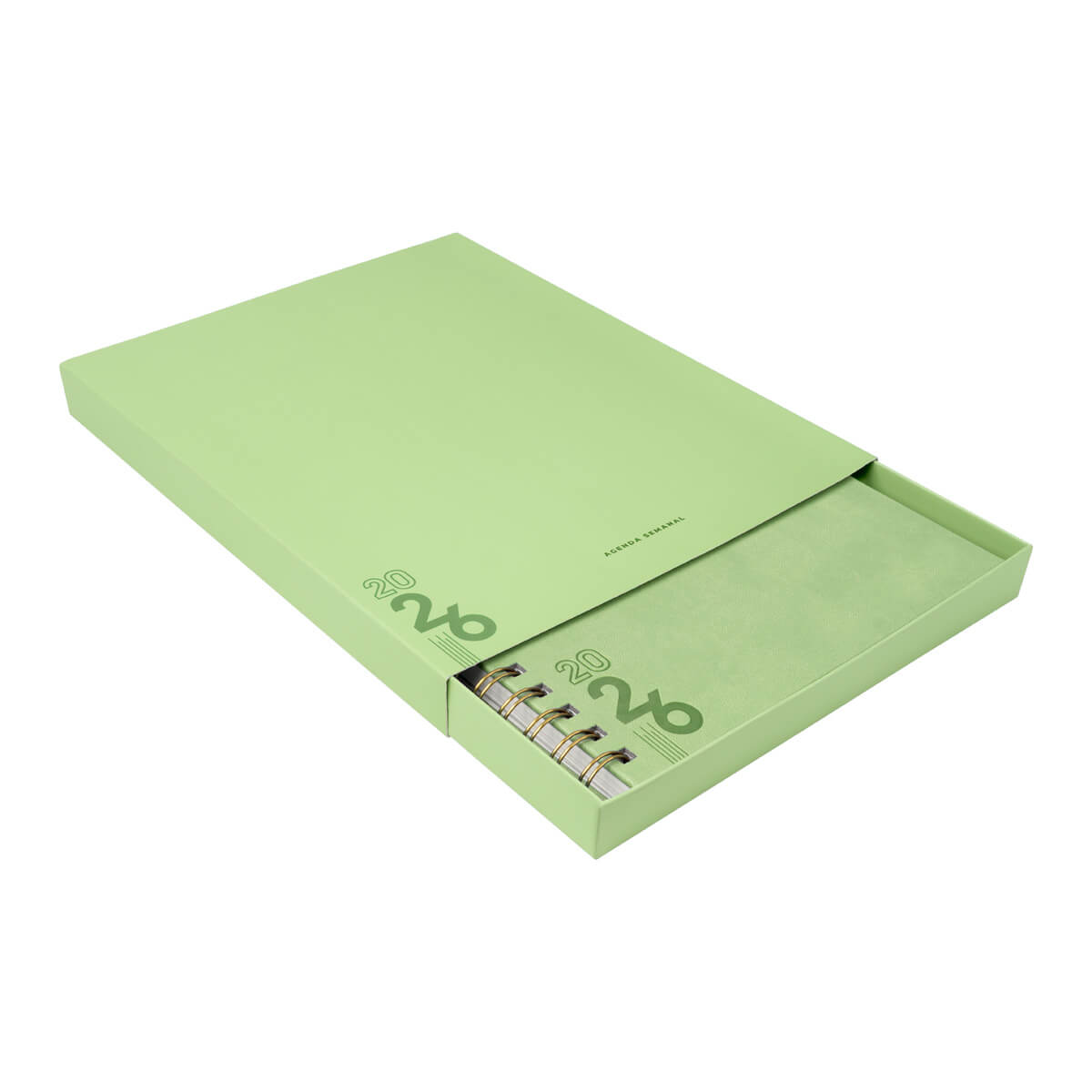 Agenda semanal con 80 hojas. Contiene datos personales, calendarios 2025-2026-2027, planeador 2026, seguimiento de nuevos hábitos, organizador de tareas, planeador de proyectos y días festivos. Incluye caja individual del mismo color a la agenda y bolígrafo.
