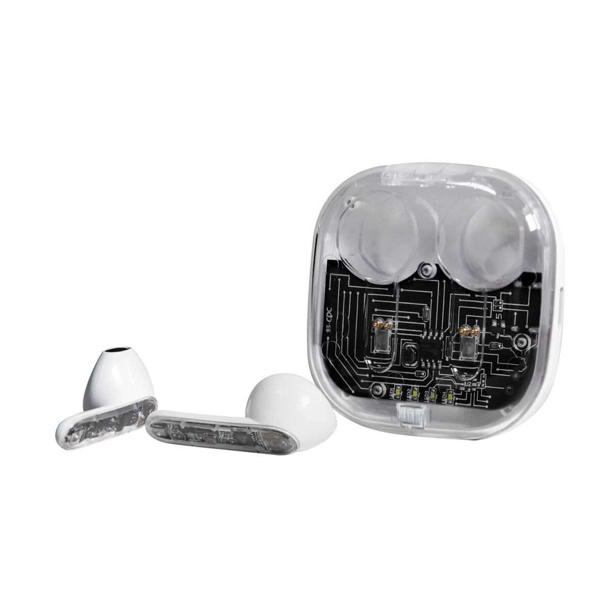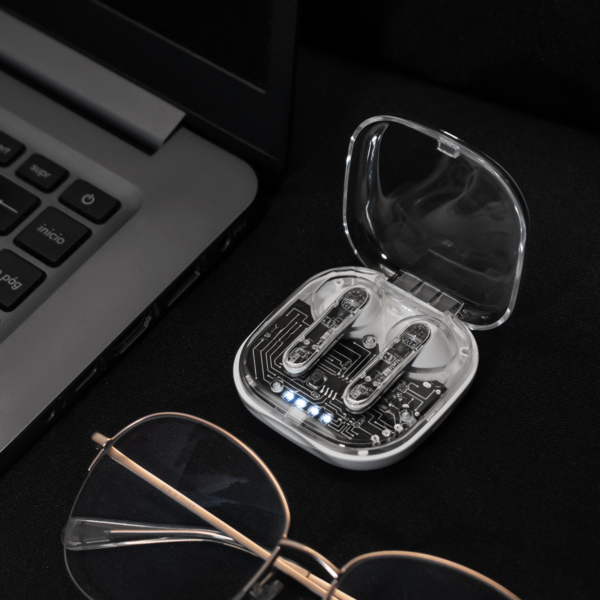 Audífonos bluetooth con base recargable. Su diseño permite una visión a su circuito interno gracias a su estructura transparente. Reproduce tu música favorita por 6 horas aproximadamente con un alcance de conexión de 10 metros. Incluye estuche con conexión tipo C, cable de carga y caja individual.