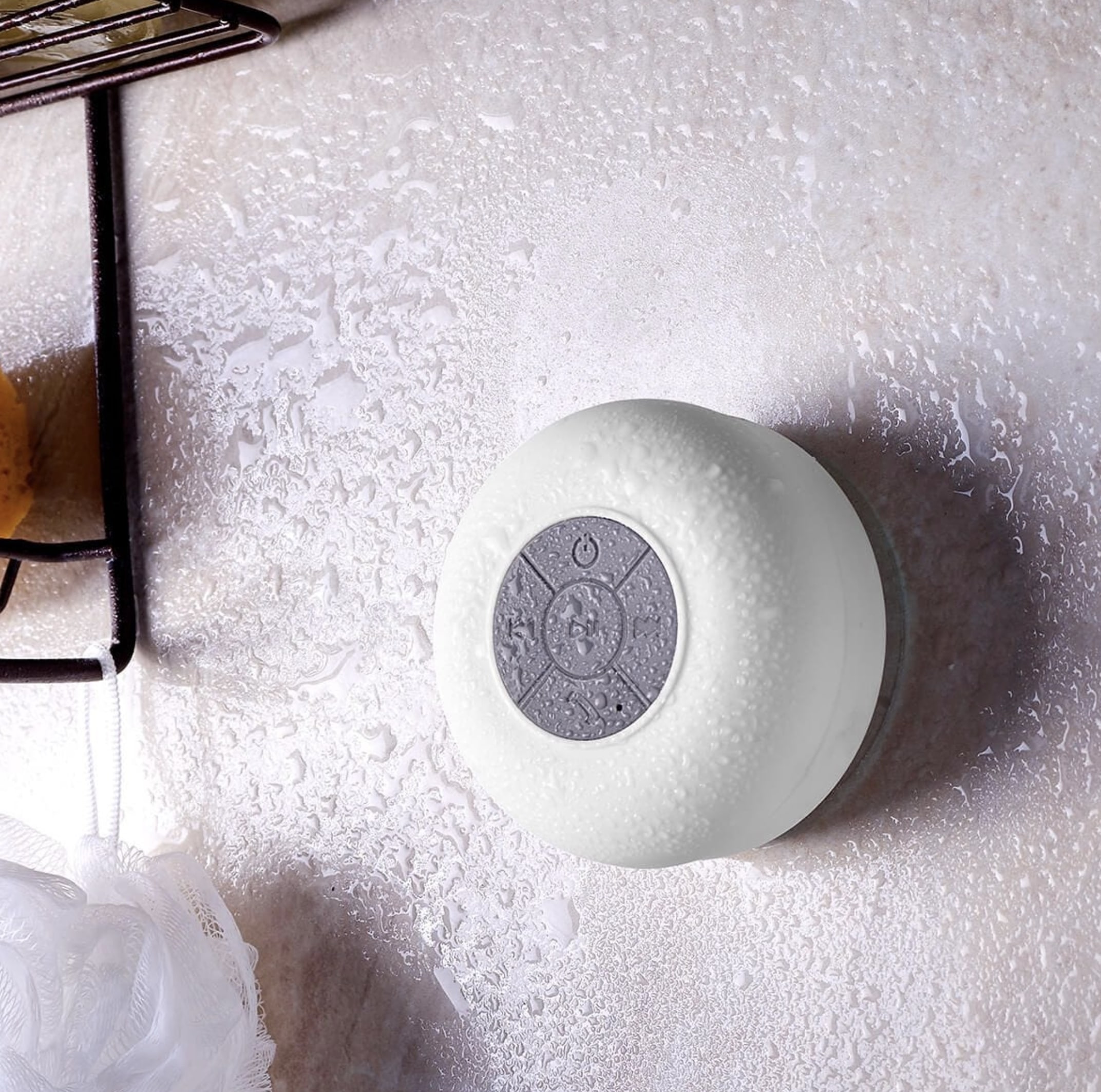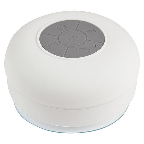 Bocina bluetooth con batería recargable. Resistente a salpicaduras de agua. Ventosa de fuerte fijación para superficies lisas. Reproducción de música 6 hrs aproximadamente. Función manos libres. Controles de volumen, reproducción de audio y micrófono. Incluye cable cargador USB.