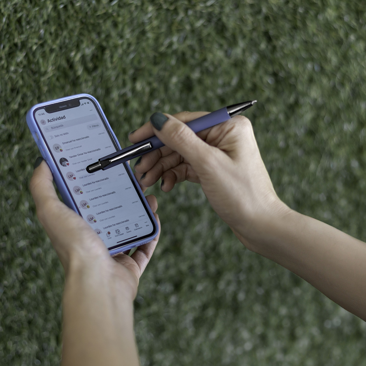 Bolígrafo con terminado tipo rubber y touch screen. Mecanismo pulsador. Clip y punta en color metalizado oscuro.