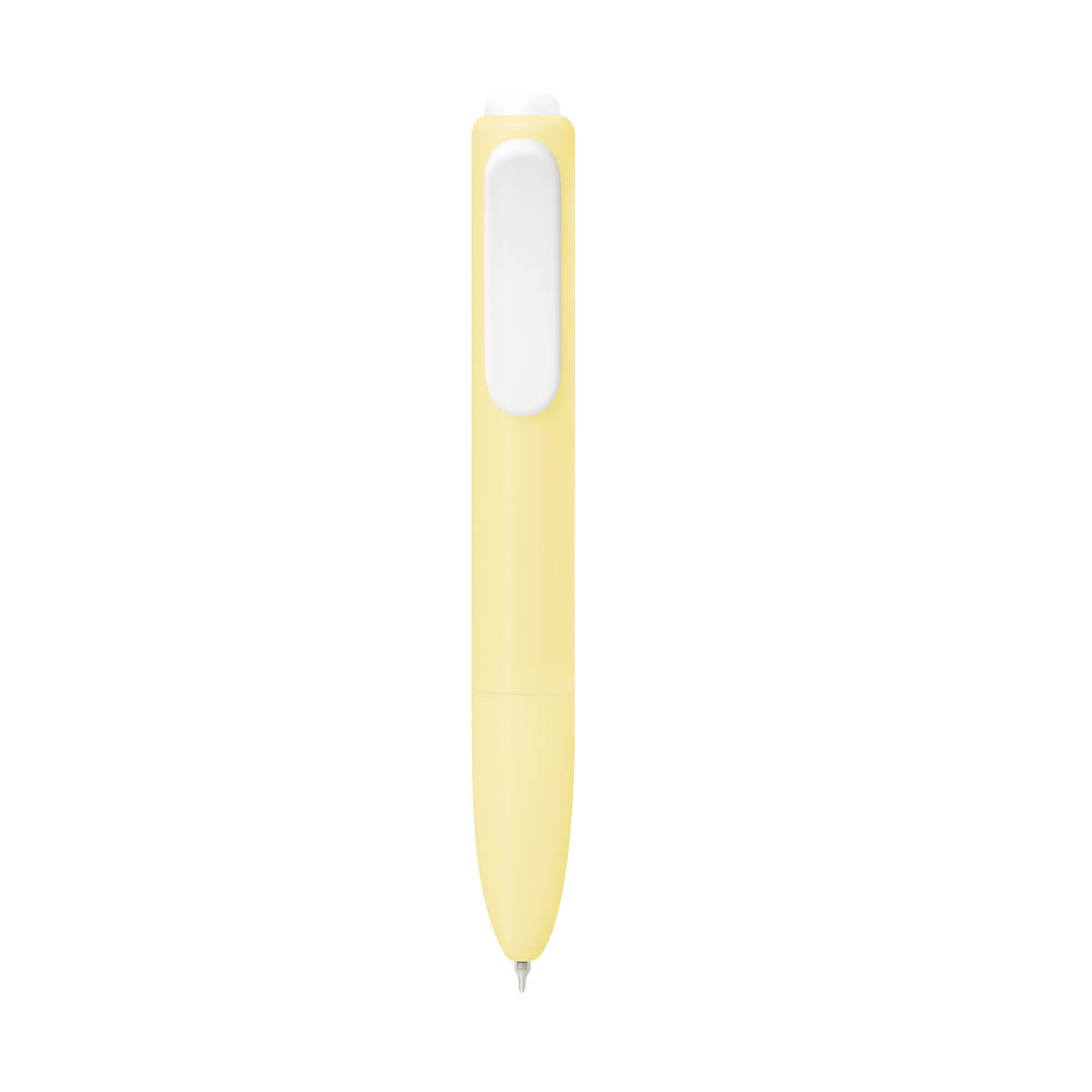 Bolígrafo de plástico con mecanismo pulsador. Su diseño destaca formas suaves y redondeadas. Agrega un clip con función de pinza que aporta un toque moderno y minimalista.