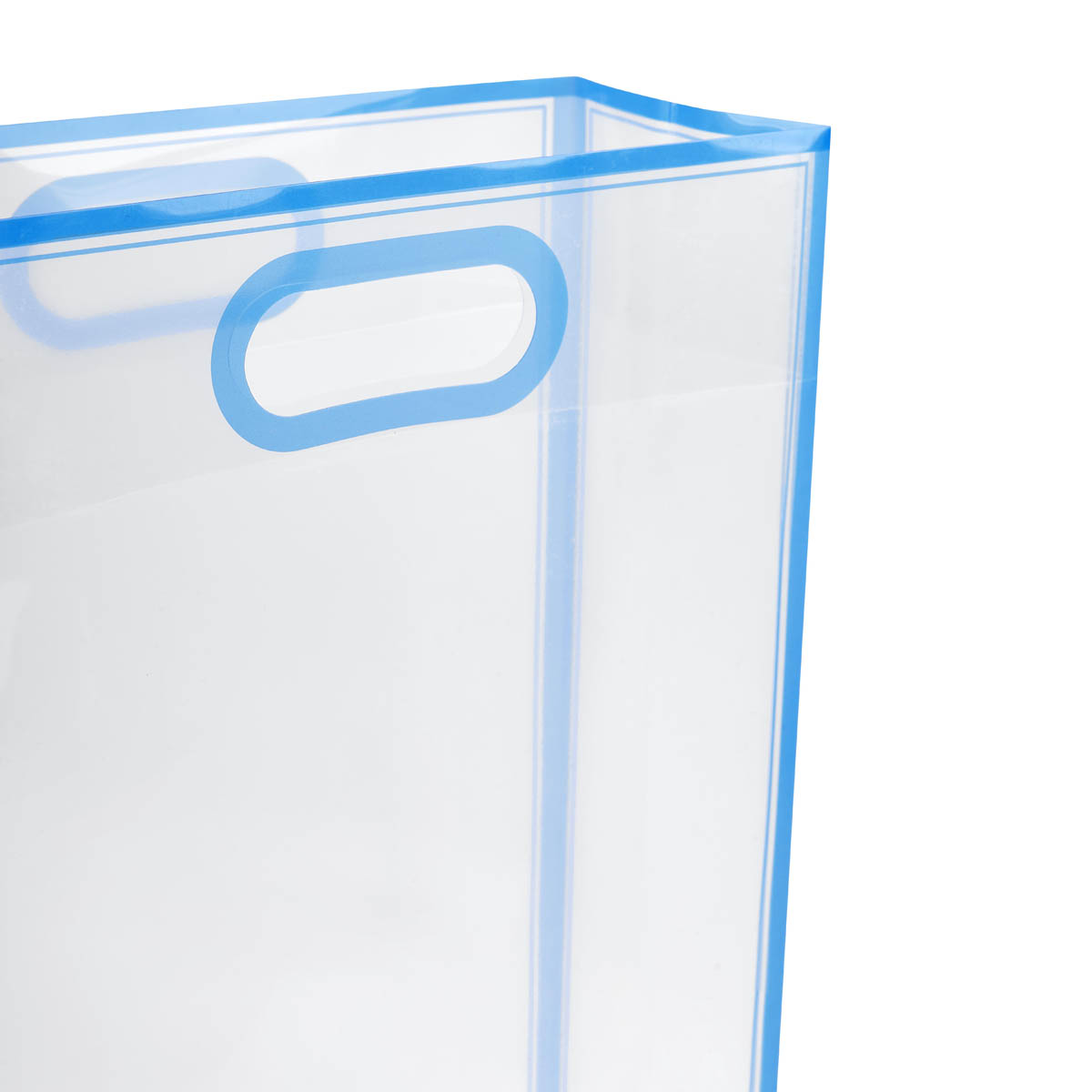 Bolsa de PVC con fuelle. Su diseño transparente con bordes de color la hace ideal para crear tus propios sets de regalo. Su asa está diseñada para llevarla cómodamente con una sola mano. Perfecta para cualquier ocasión especial.