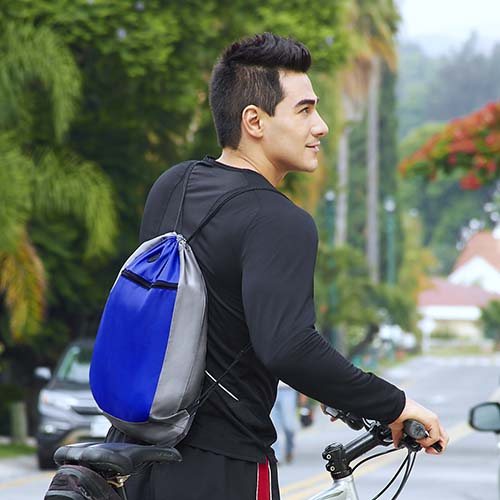 Bolsa-mochila con tirantes de cordón y cerrado de jareta. Bolsa frontal con cierre y aditamento especial para audífonos.