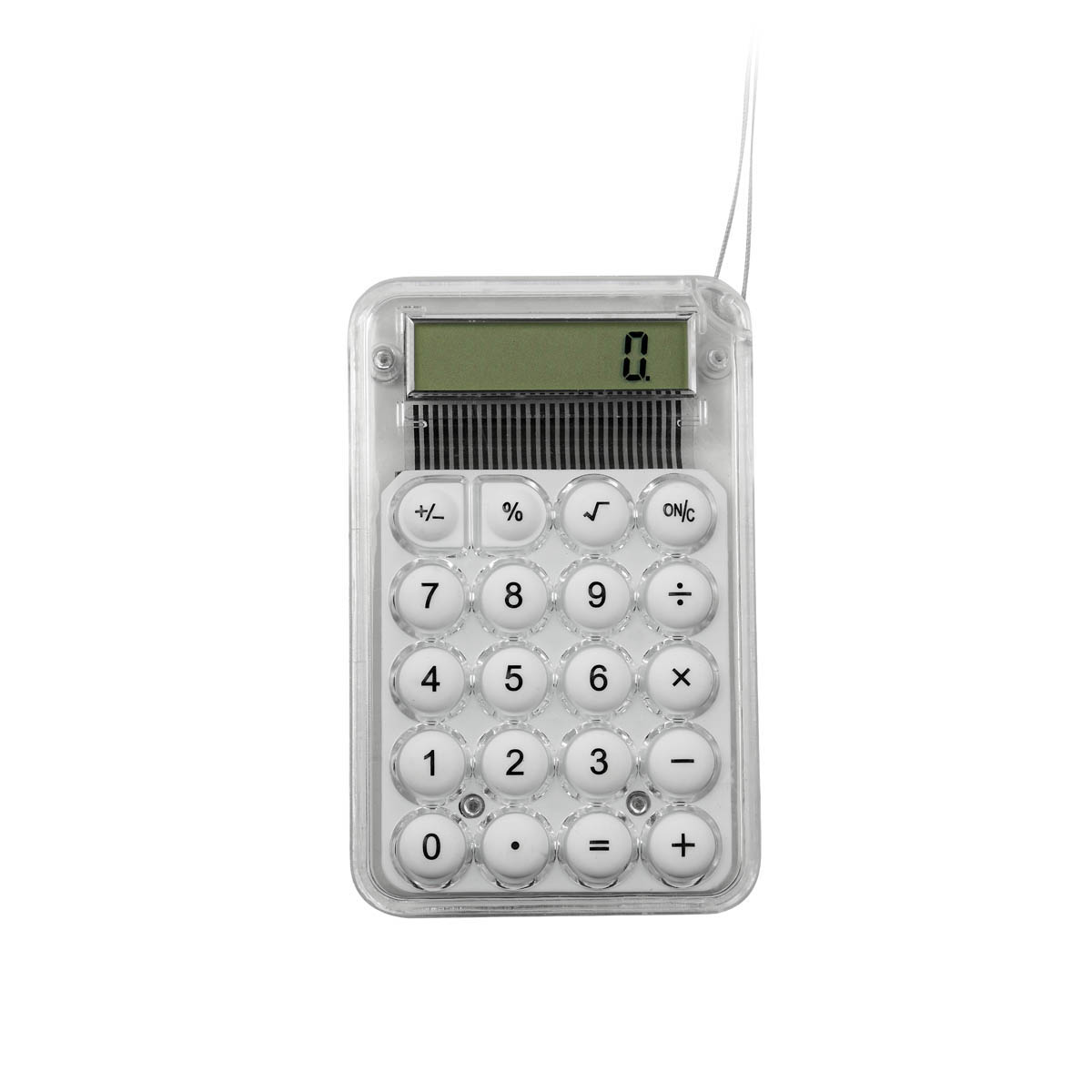 Calculadora de 8 dígitos. Ideal para funciones básicas. Incluye cordón de 40 cm. Batería de botón incluida.