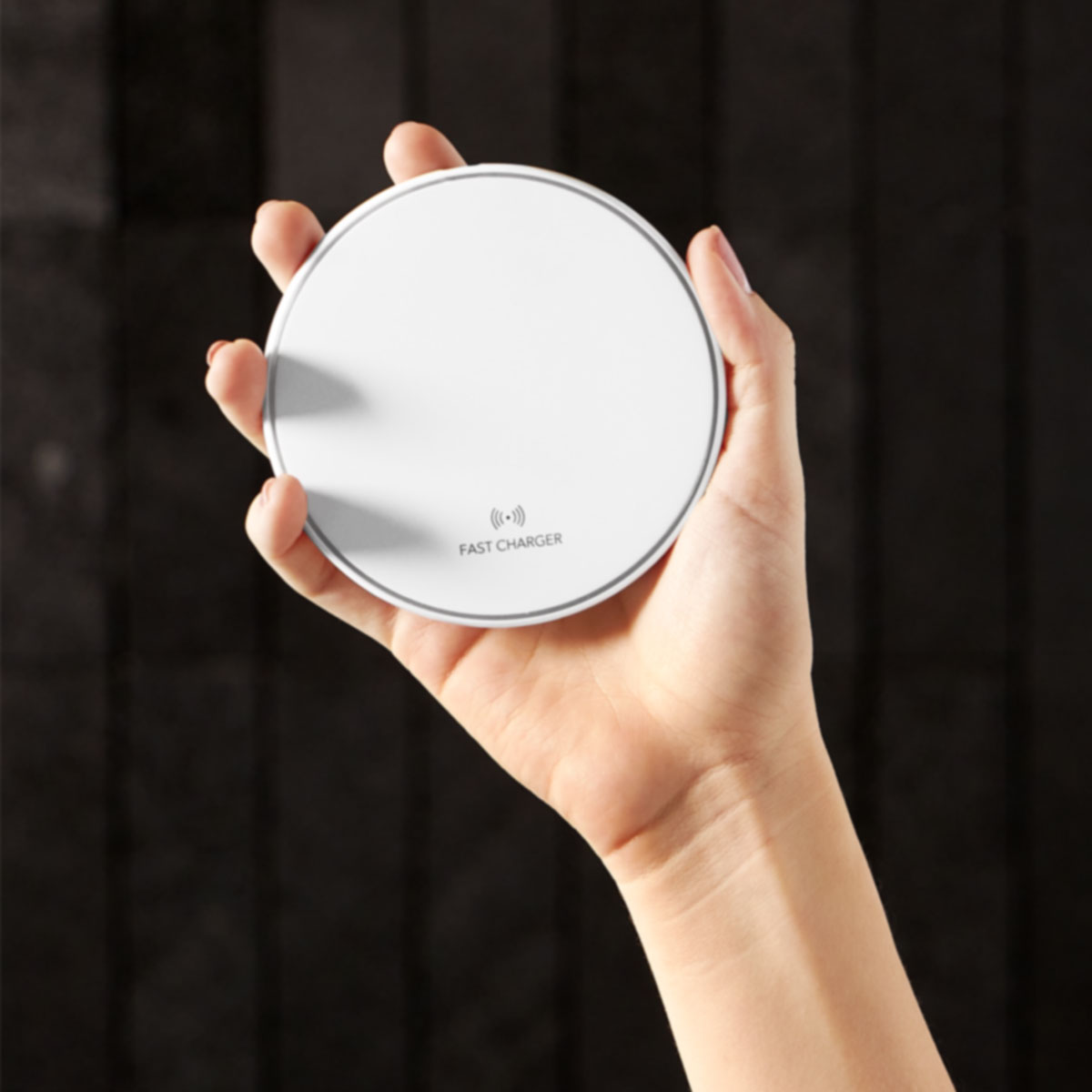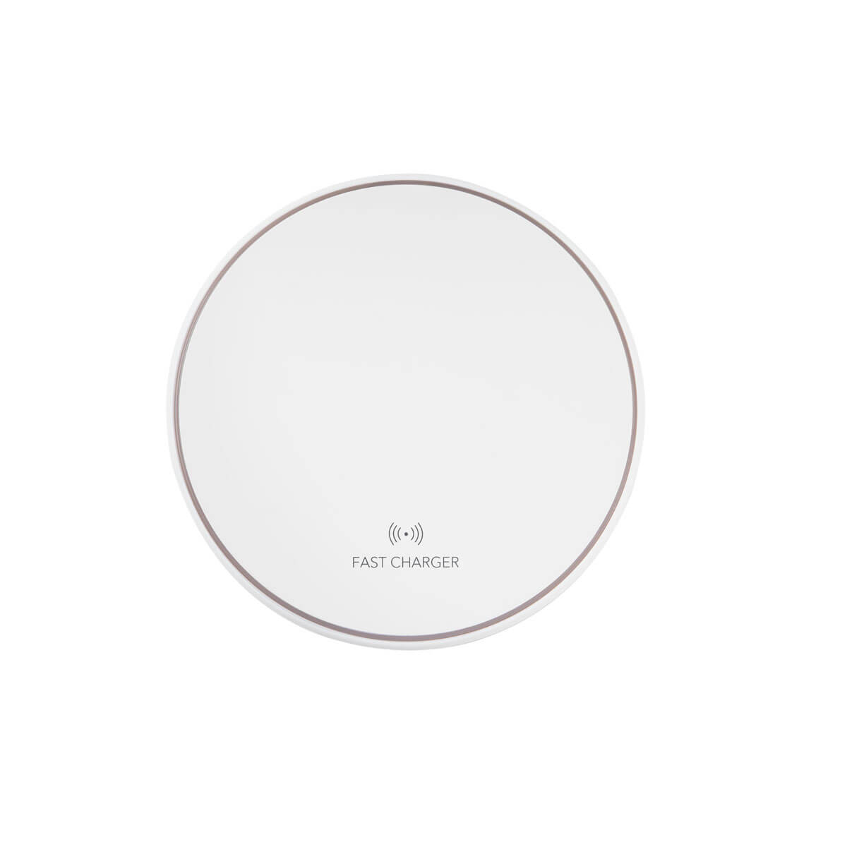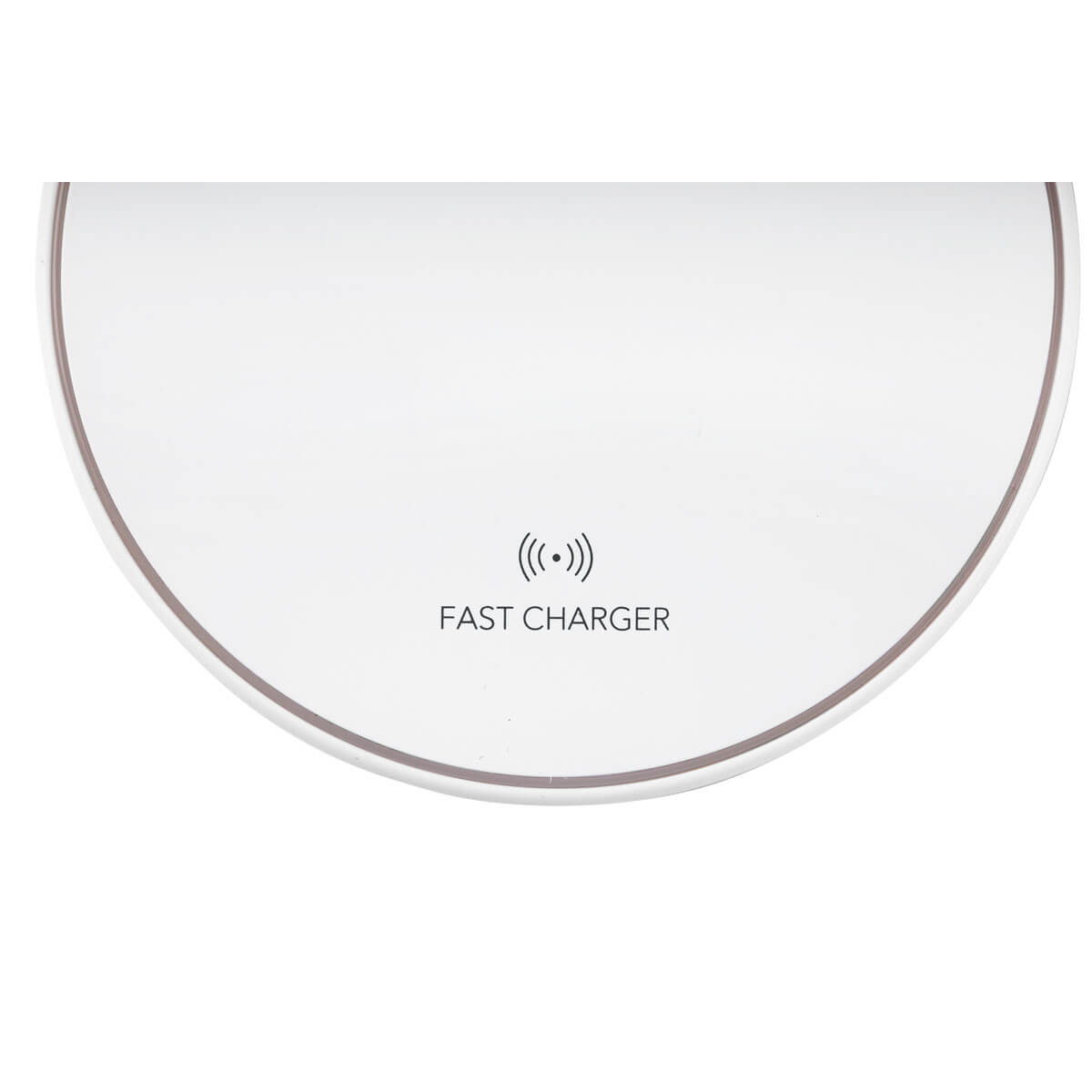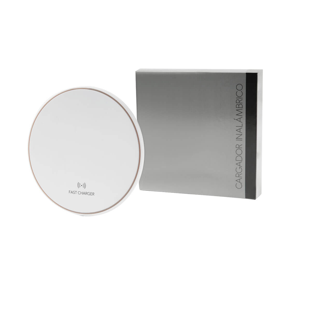 Cargador inalámbrico “fast charge”. Velocidad máxima de carga 15W. Se enciende luz color verde cuando está en reposo y luz color azul cuando está en proceso de carga. Incluye cable auxiliar tipo C y caja individual.