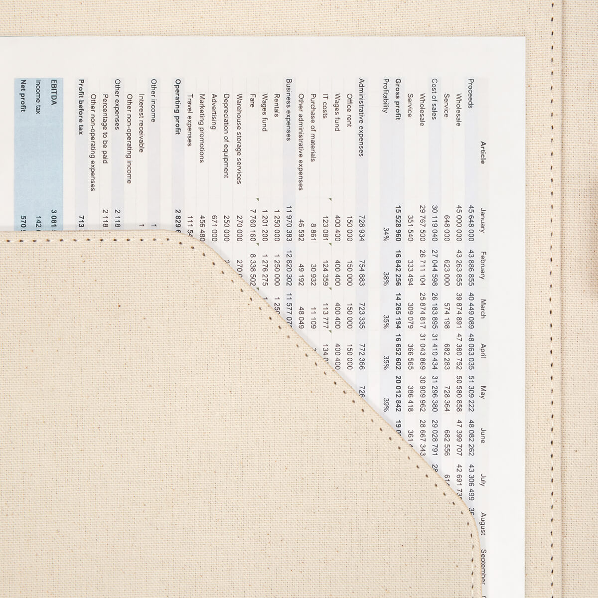 Carpeta con compartimentos para hojas y tarjetas. Incluye un block de raya tamaño A4 con 20 hojas y un elástico para sujetar un bolígrafo. No incluye bolígrafo.