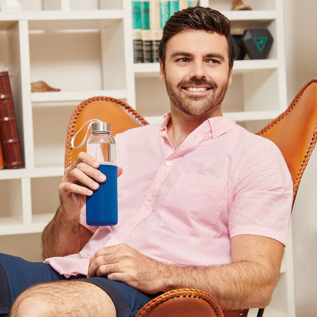 Cilindro de vidrio con tapa metálica de rosca con jareta de tela y funda removible de neopreno con asa que no permite transferir calor de las manos o del ambiente a la bebida. Incluye caja individual.