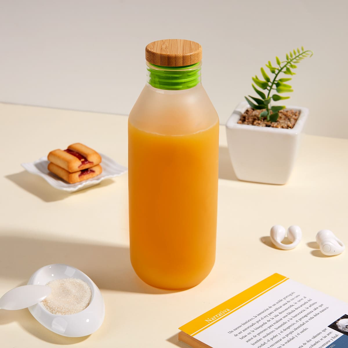 Cilindro de vidrio con terminado frosty. Tapa de bambú y sello de silicón de color. Incluye caja individual. El bambú es un producto natural el cual puede presentar variaciones en tonalidades y vetas.
