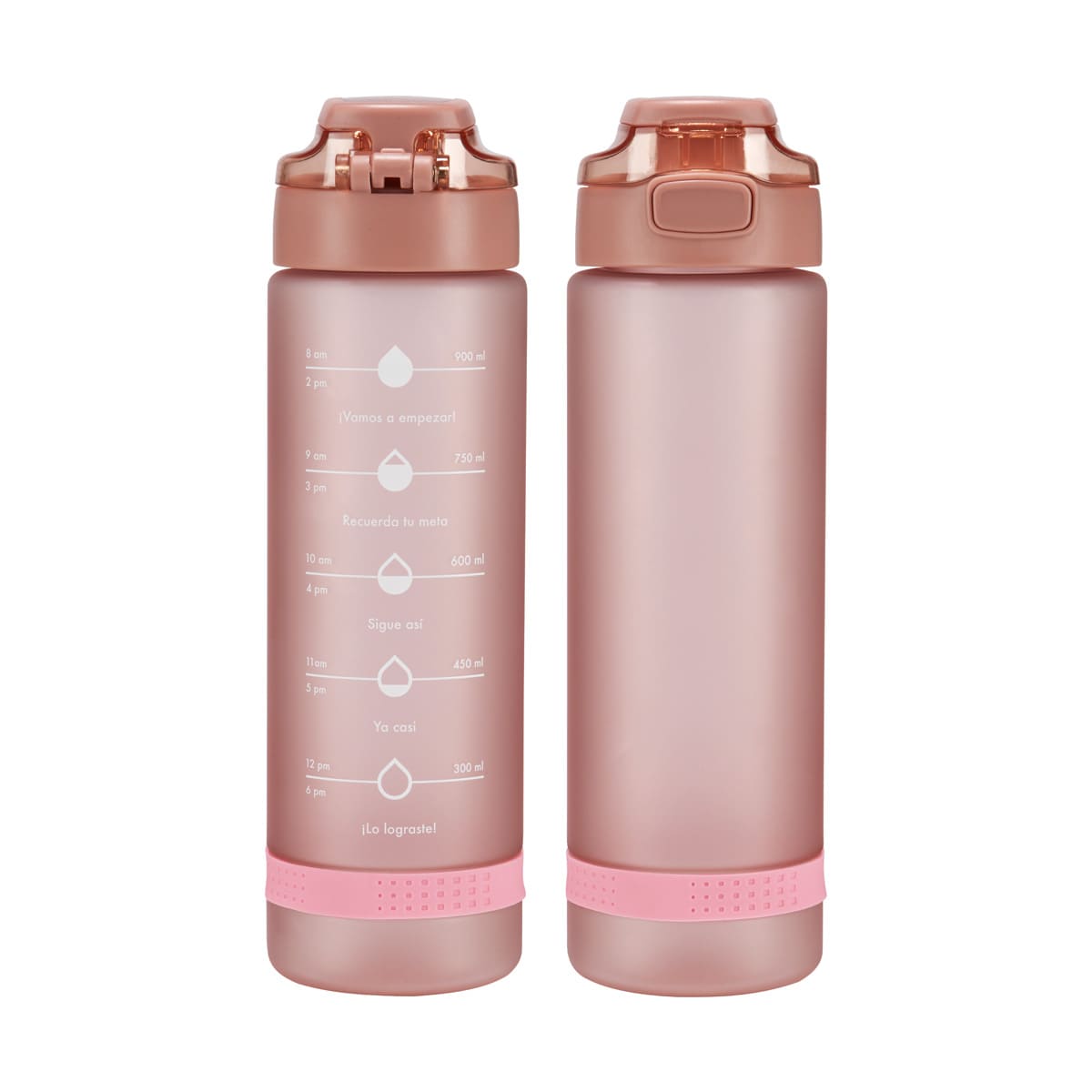 Tapa de plástico con cierre de rosca hermética y boquilla. Sobretapa push con botón y asa plegable. Cuerpo con terminado tipo rubber, suave al tacto. Cuenta con un detalle de silicón en la parte inferior. Incluye marcador de mililitros y horas lo que te permite medir fácilmente la cantidad de agua que bebes a lo largo del día y llevar un control de tu hidratación. Incluye caja individual.