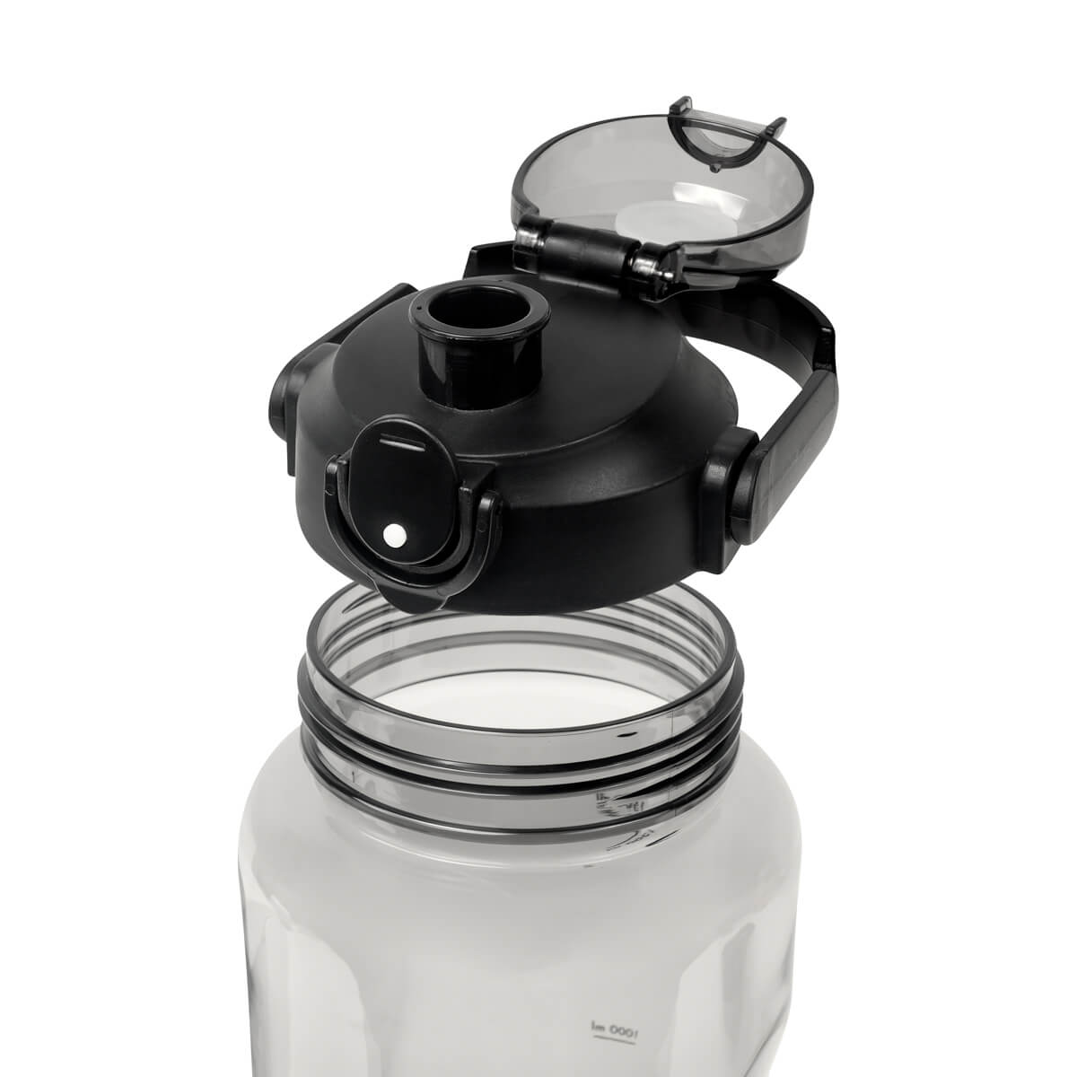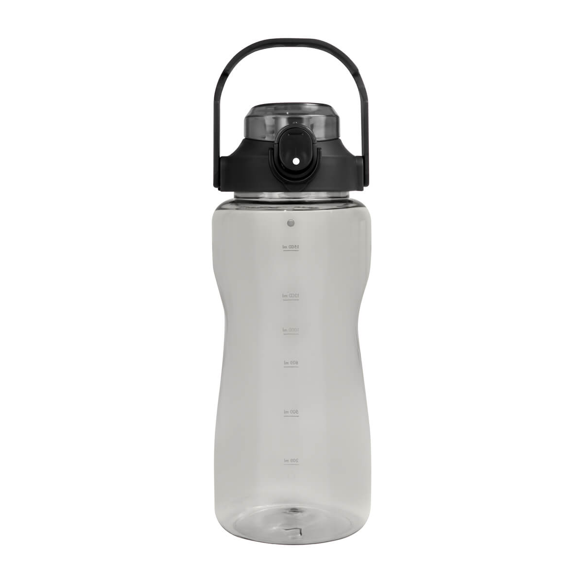 Tapa de plástico con cierre de rosca y boquilla, sobretapa push con botón de seguridad y asa plegable con phone holder para colocar el celular. Cuerpo traslúcido, resaques laterales para un mejor agarre, indicador de mililitros para motivar y controlar tus hábitos de hidratación. Incluye caja individual.