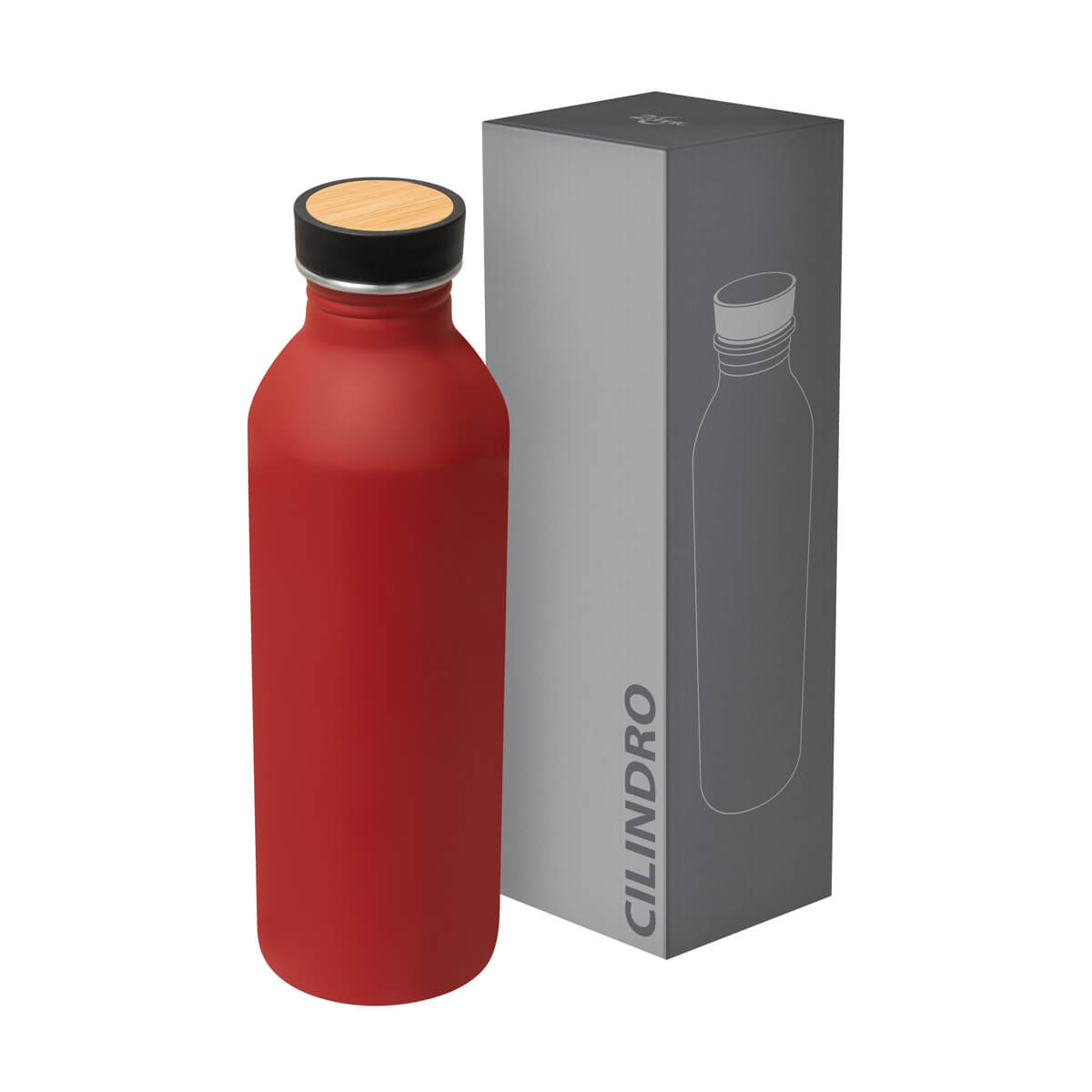 Cilindro metálico de una pared. Tapa de plástico y bambú, su sistema de rosca, permite cerrarlo facilmente y prevenir derrames. Su cuerpo en terminado mate le agrega un toque elegante. El bambú es un producto natural el cual puede presentar variaciones en tonalidades y vetas. Capacidad de 18 Oz. Incluye caja individual.