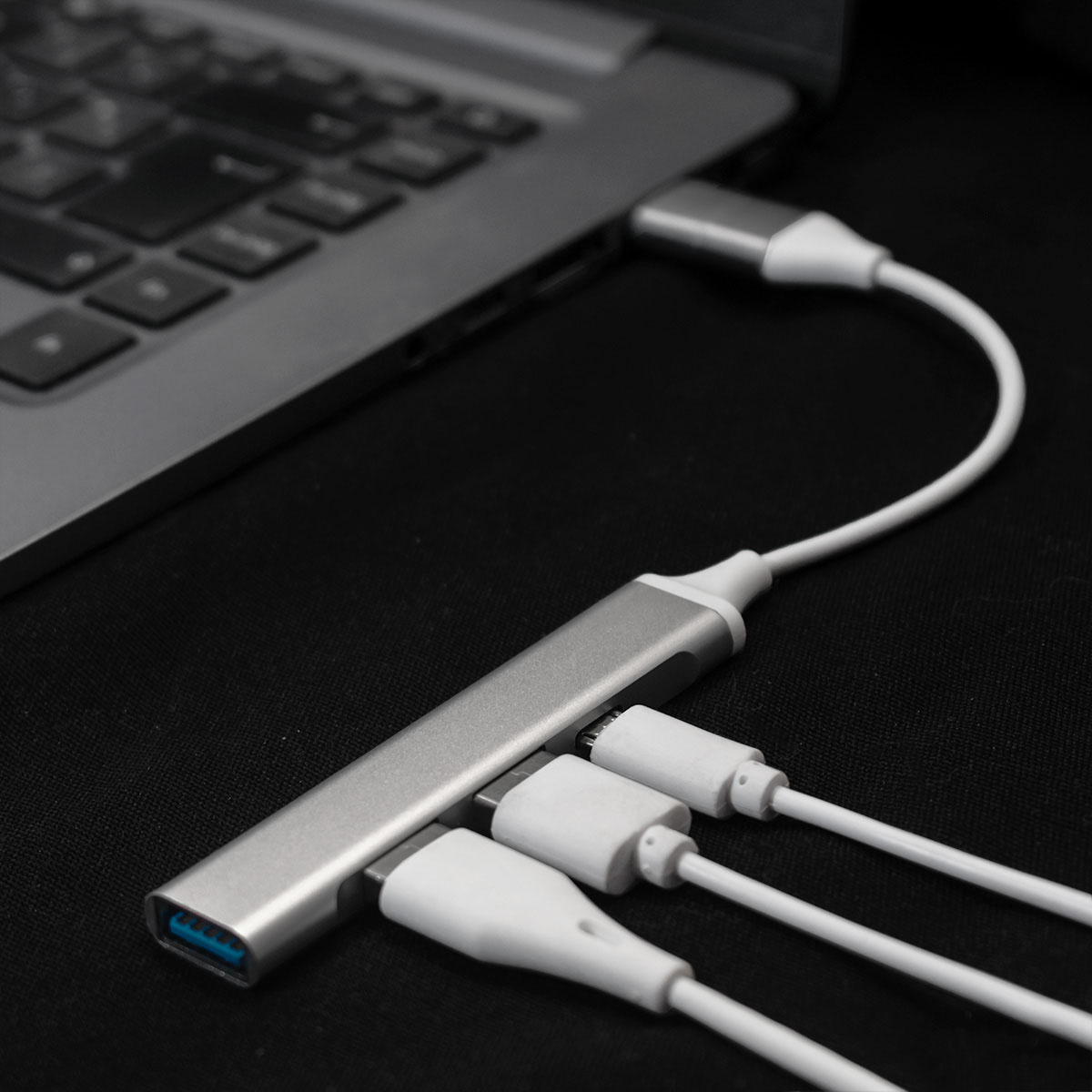 Concentrador acabado metálico con 3 puertos USB y 1 puerto tipo C. Soporta transferencia de datos. Cable de conexión con USB y tipo C.