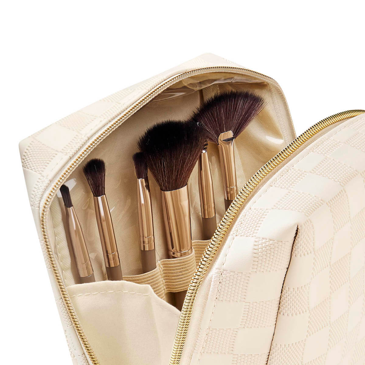 Organizador de cosméticos.Compartimento con abertura amplia facilita el acceso y la organización de brochas y accesorios, manteniéndolos siempre en orden y a la vista. Además, la placa metálica al frente añade un toque de distinción. Ideal para quienes valoran la practicidad en su rutina de belleza.