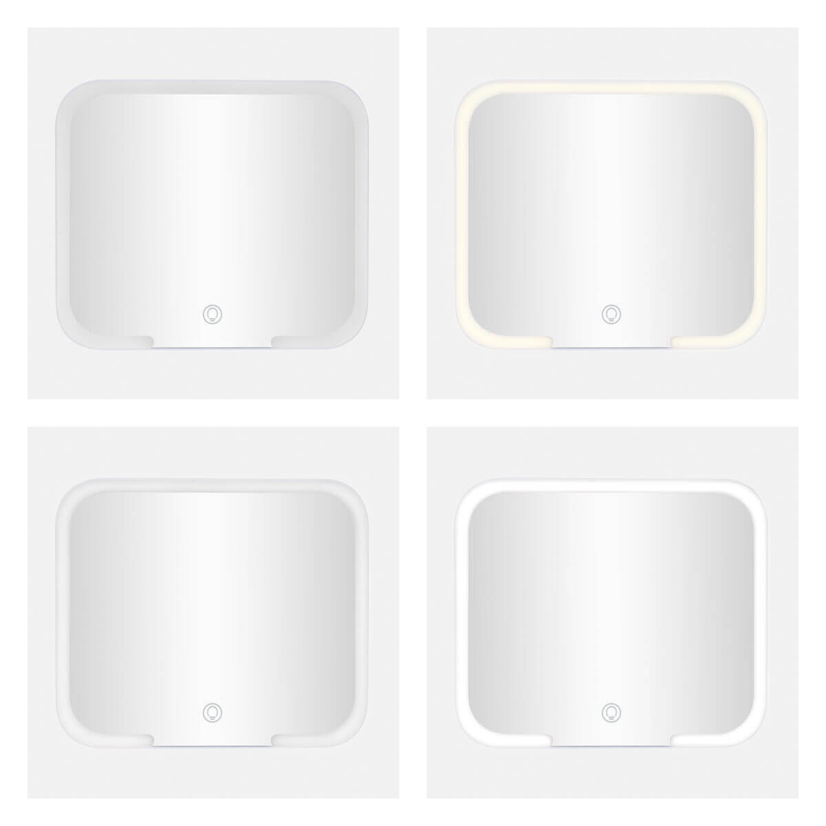 Organizador de maquillaje y brochas. En su interior contiene un amplio espejo de iluminación LED con 3 modos de luz: fría, natural y cálida, las cuales cambian pulsando el botón del sensor táctil one touch. Duración de luz 2 hrs. Puerto de carga tipo C. Incluye cable de carga tipo C.