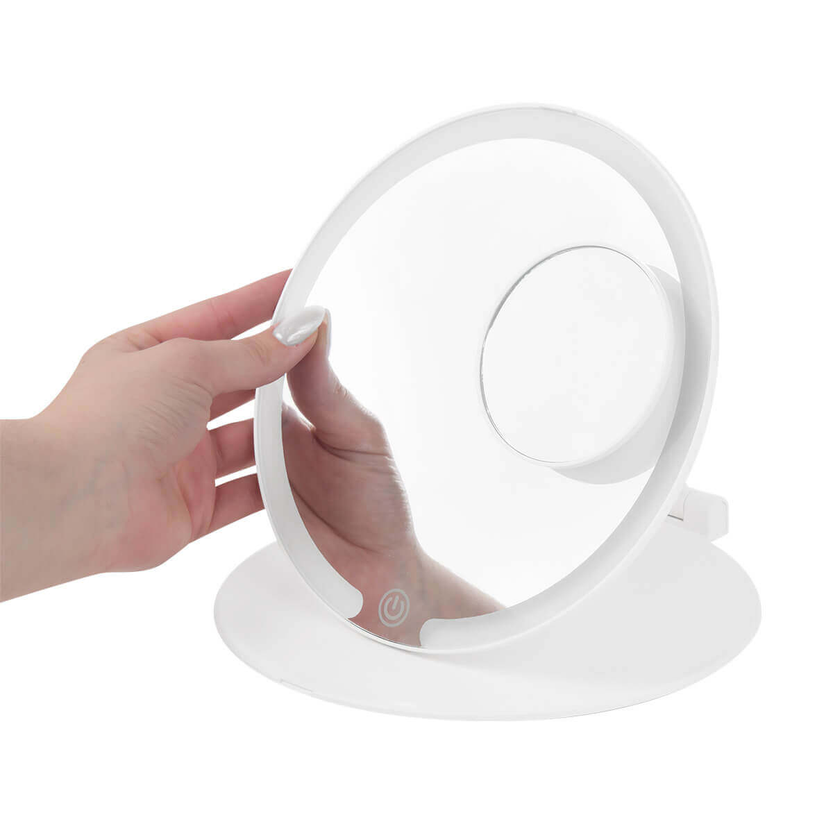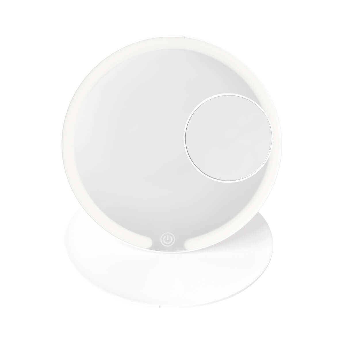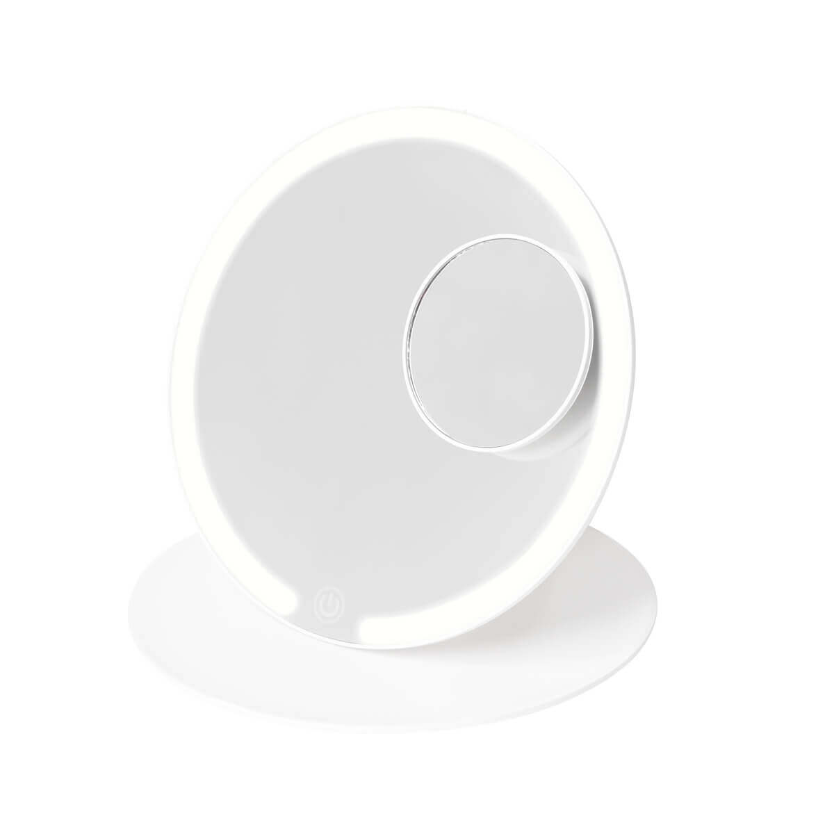 Espejo plegable con iluminación LED con 3 modos de luz: fría, natural y cálida. Pulsando el botón del sensor táctil one touch. Duración de luz de 3.5 hrs. Incluye espejo magnético de aumento 5x, puerto de carga y cable tipo C.