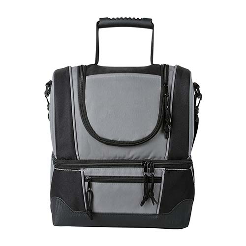Interior plastificado impermeable. Bolsa principal, red interna para separar, bolsa frontal con cierre, bolsa lateral de red y correa ajustable. Capacidad para 12 latas.