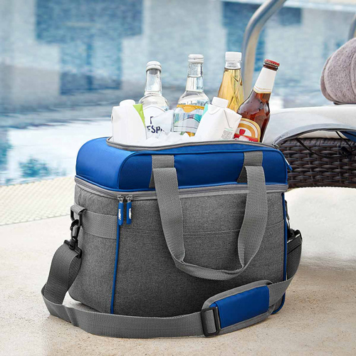 Interior plastificado impermeable. Bolsa principal y bolsa superior con cierre para fácil acceso a interior, bolsa frontal, asas y correa ajustable. Capacidad en parte superior para 4 latas y en parte inferior 10 latas.