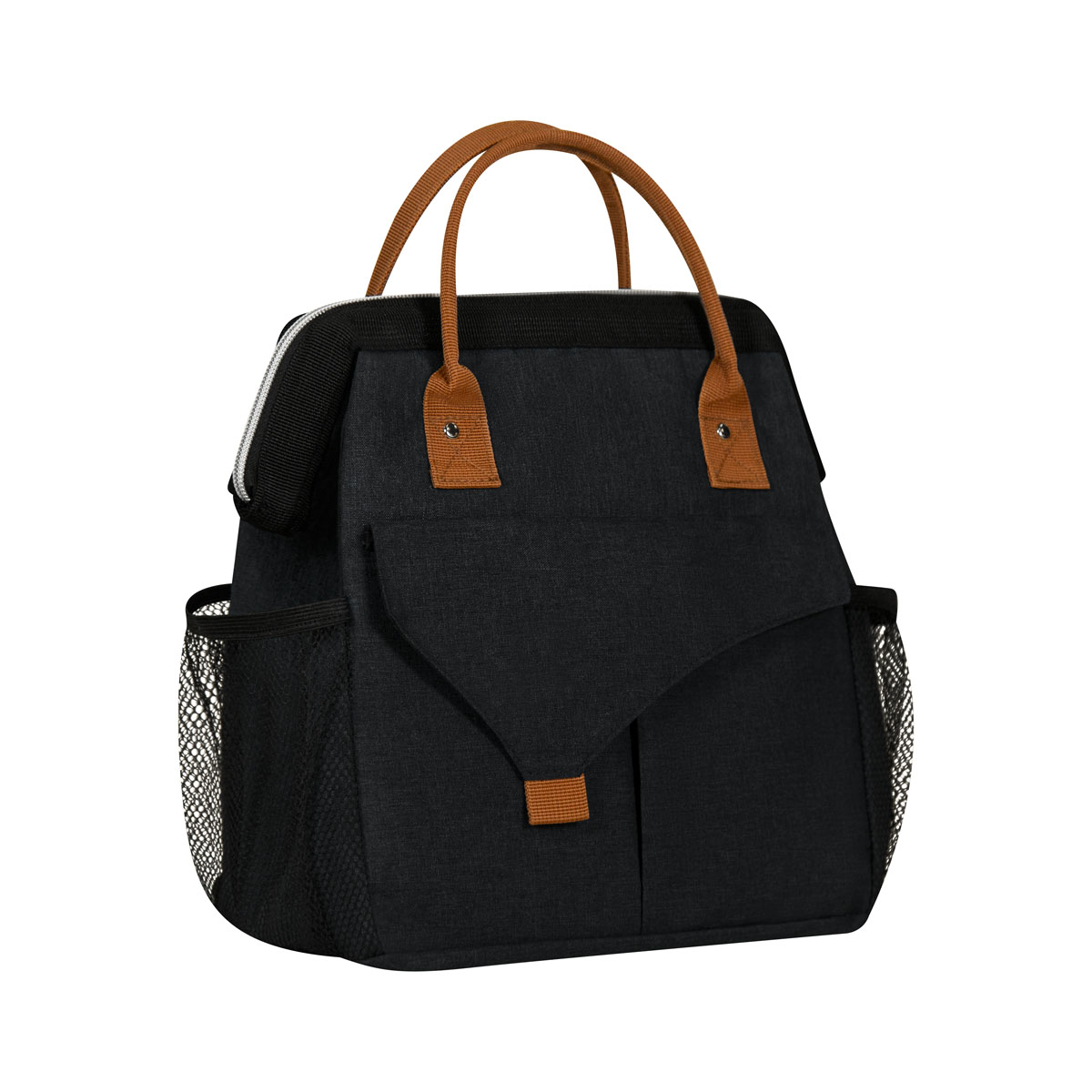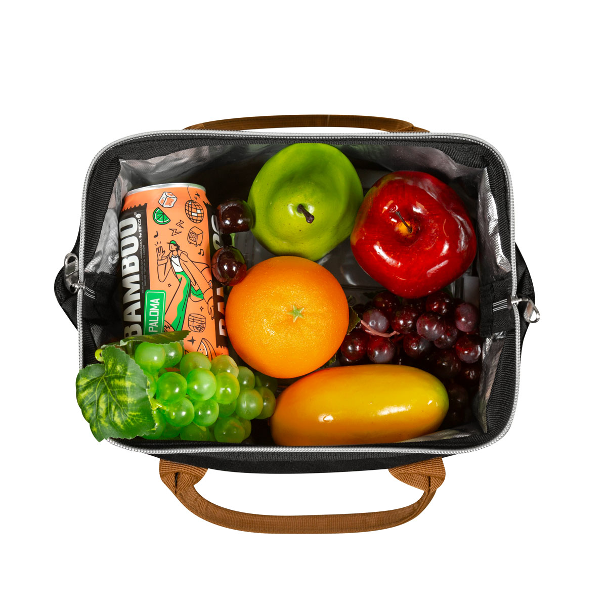 Hielera con bolsa principal con cierre y varilla metálica, que permite mantener la estructura y facilita el acceso a tus refrigerios. Además, cuenta con dos compartimentos laterales con malla, para organizar objetos adicionales y una práctica bolsa frontal, que permite tener utensilios o pequeños accesorios siempre a la mano. Capacidad para 16 latas.