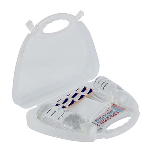 Incluye gel sanitizante de 60 ml, 1 cubre boca, 2 gasas, 3 curitas, 20 cotonetes, 1 mertodol de 40 ml y estuche de plástico.
