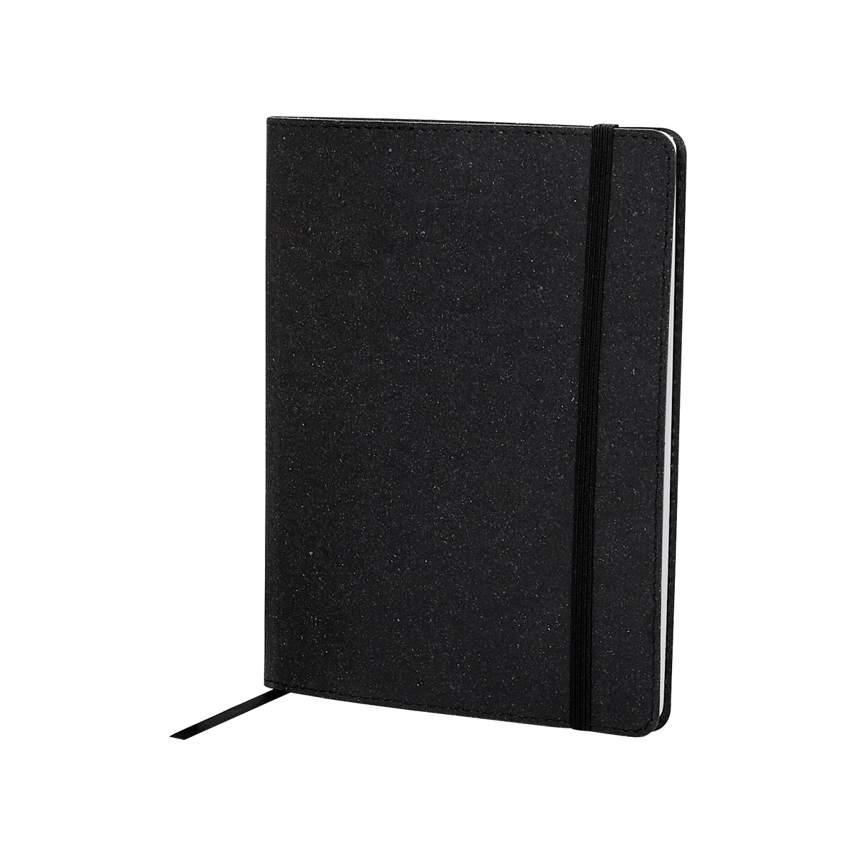 Libreta con 70 hojas de raya fabricada con piel reciclada. Incluye separador de hojas y elástico para cerrar.