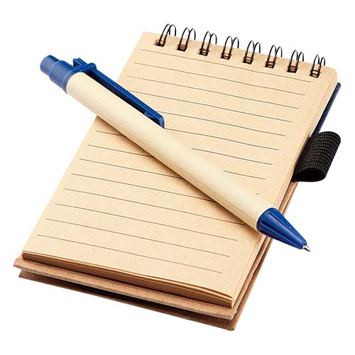 Libreta con 50 Hojas de raya. Incluye bolígrafo ecológico y elástico para cerrar.