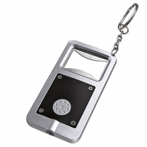 Llavero destapador con lámpara de 1 LED. Incluye 2 baterías de botón.