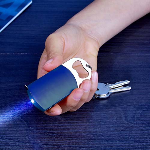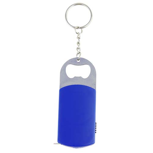 Llavero destapador con lámpara de 1 LED y flexómetro de cinta metálica de 1 m.
