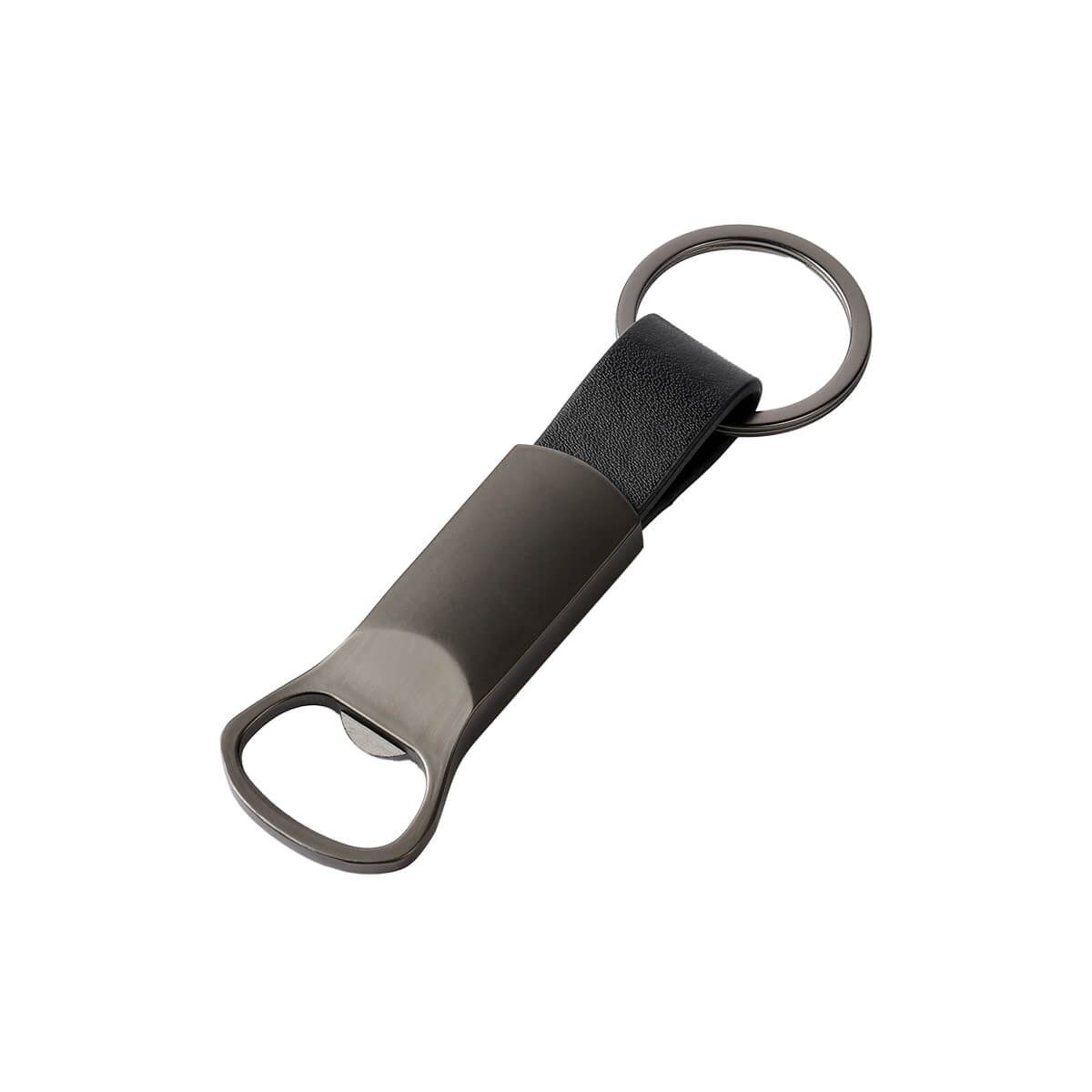 Llavero destapador metálico con terminado mate. Detalle en curpiel que estiliza su diseño.