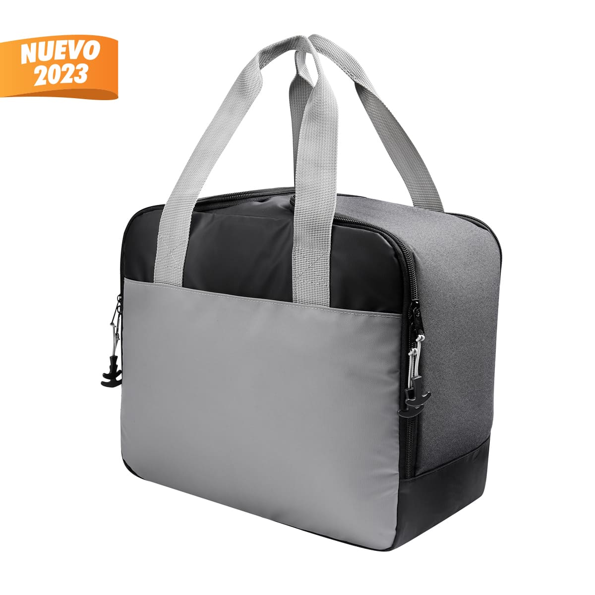 Lonchera con interior plastificado. Su compartimento principal incluye dos cierres independientes y un separador interno que permite utilizar cada espacio por separado. Incluye broches de velcro que permite retirarlo fácilmente y obtener así mayor espacio. Bolsa frontal con cierre de velcro y asas de mano.