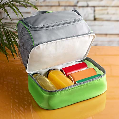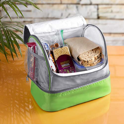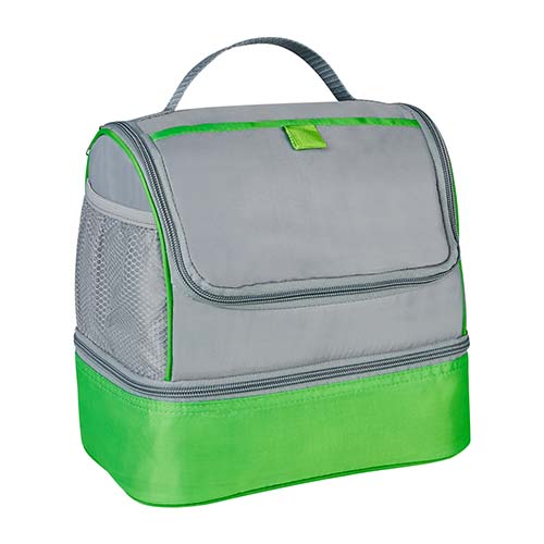 Interior plastificado. Doble compartimento con cierre. Bolsa lateral de red y asa de agarre superior. Capacidad para 9 latas.