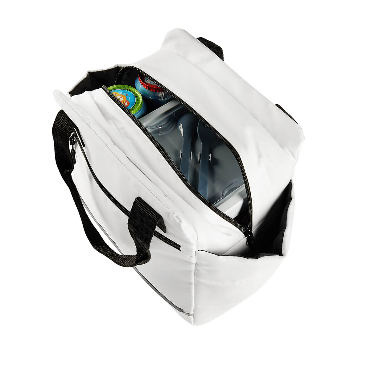 Lonchera con interior plastificado. Compartimento principal con cierre, dos bolsillos laterales y un bolsillo frontal también con cierre, ideal para llevar contigo pequeños snacks. Adicional, agregar un detalle reflejante en la parte frontal, lo que aporta un toque de diseño. Ideal para escuela u oficina, lleva tus alimentos con estilo y de forma segura. Capacidad 12 latas.