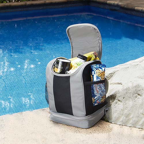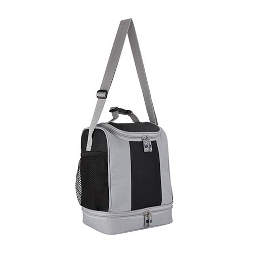 Interior plastificado. Cuenta con compartimentos superior e inferior con cierre. Incluye bolsas laterales de red, asa con broche y correa ajustable. Capacidad para 5 latas.