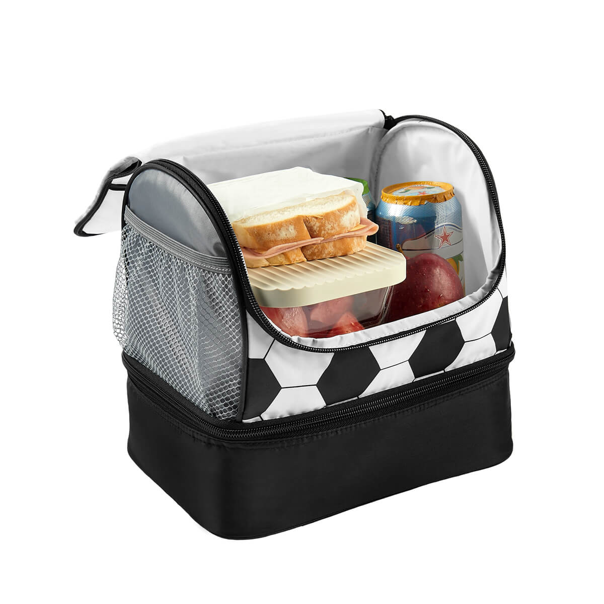 Lonchera con interior plastificado. Doble compartimento con cierre. Bolsa lateral de red y asa de agarre superior. Capacidad para 9 latas.