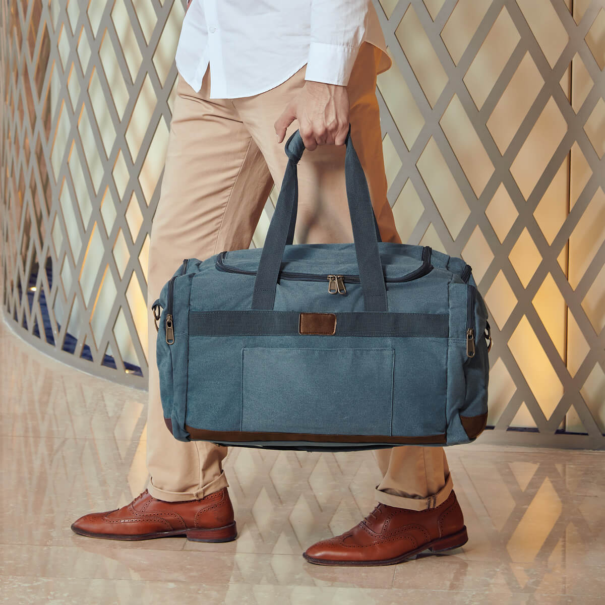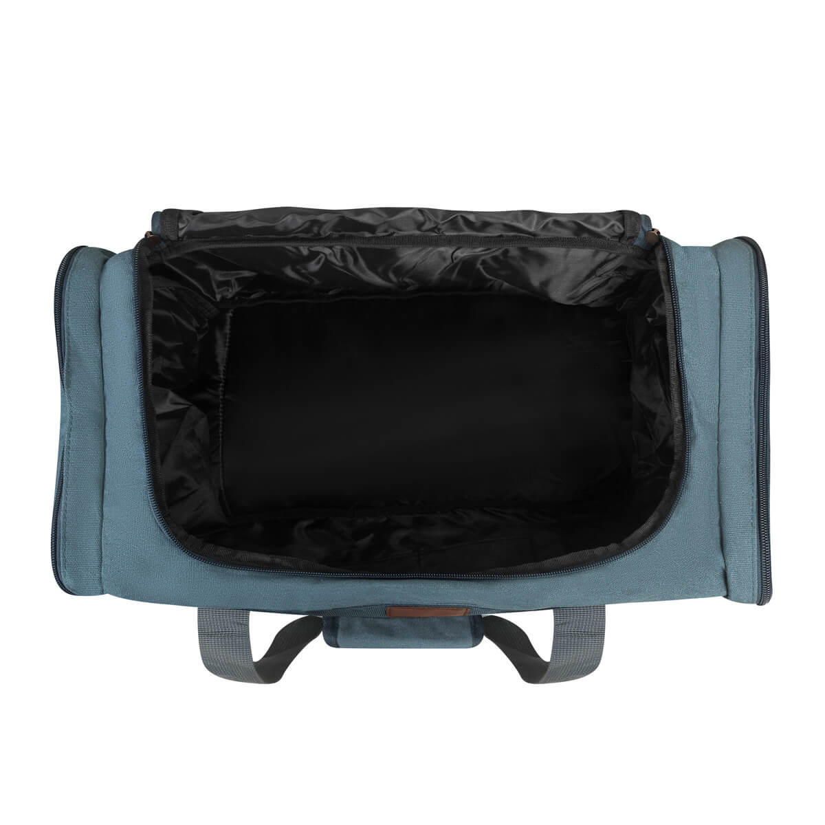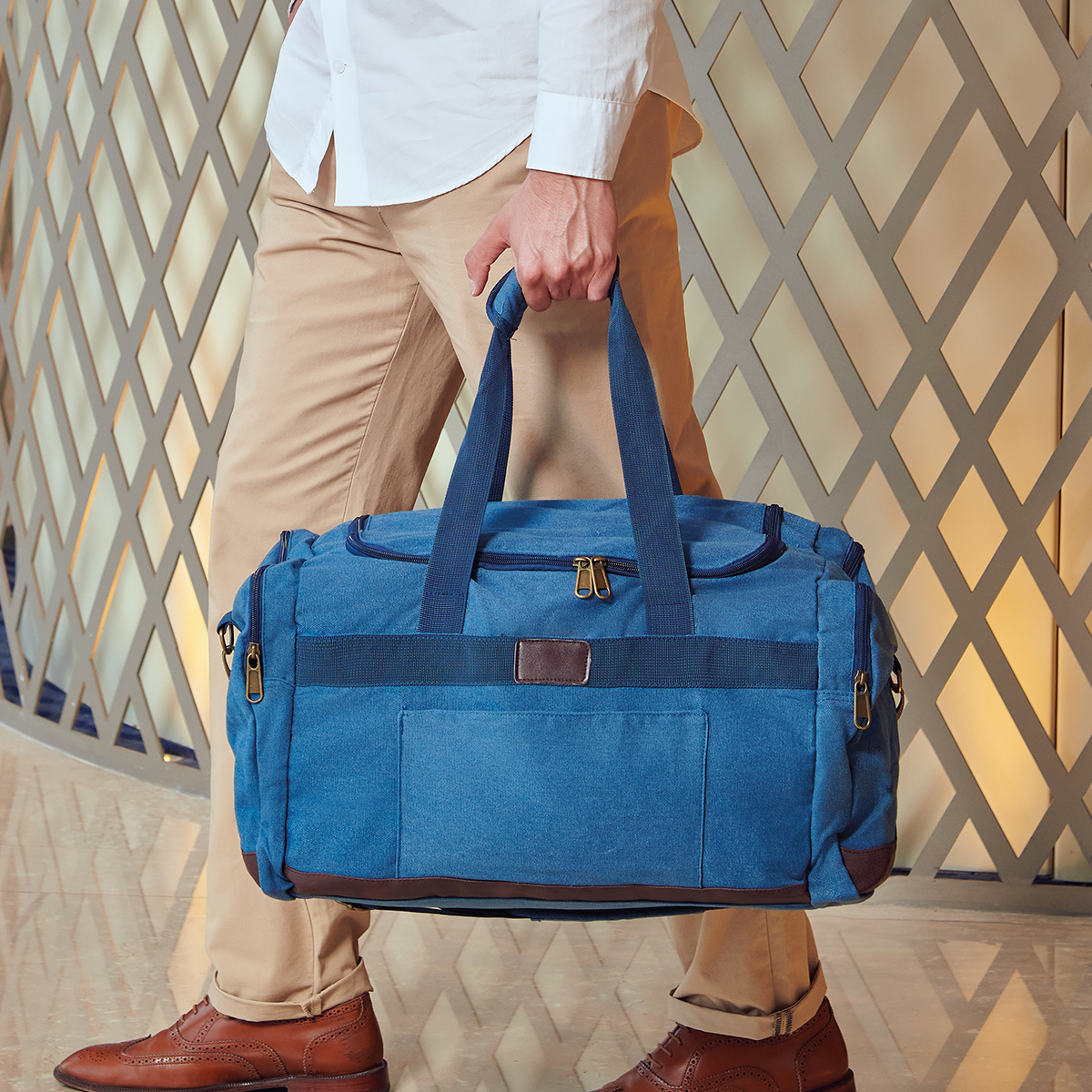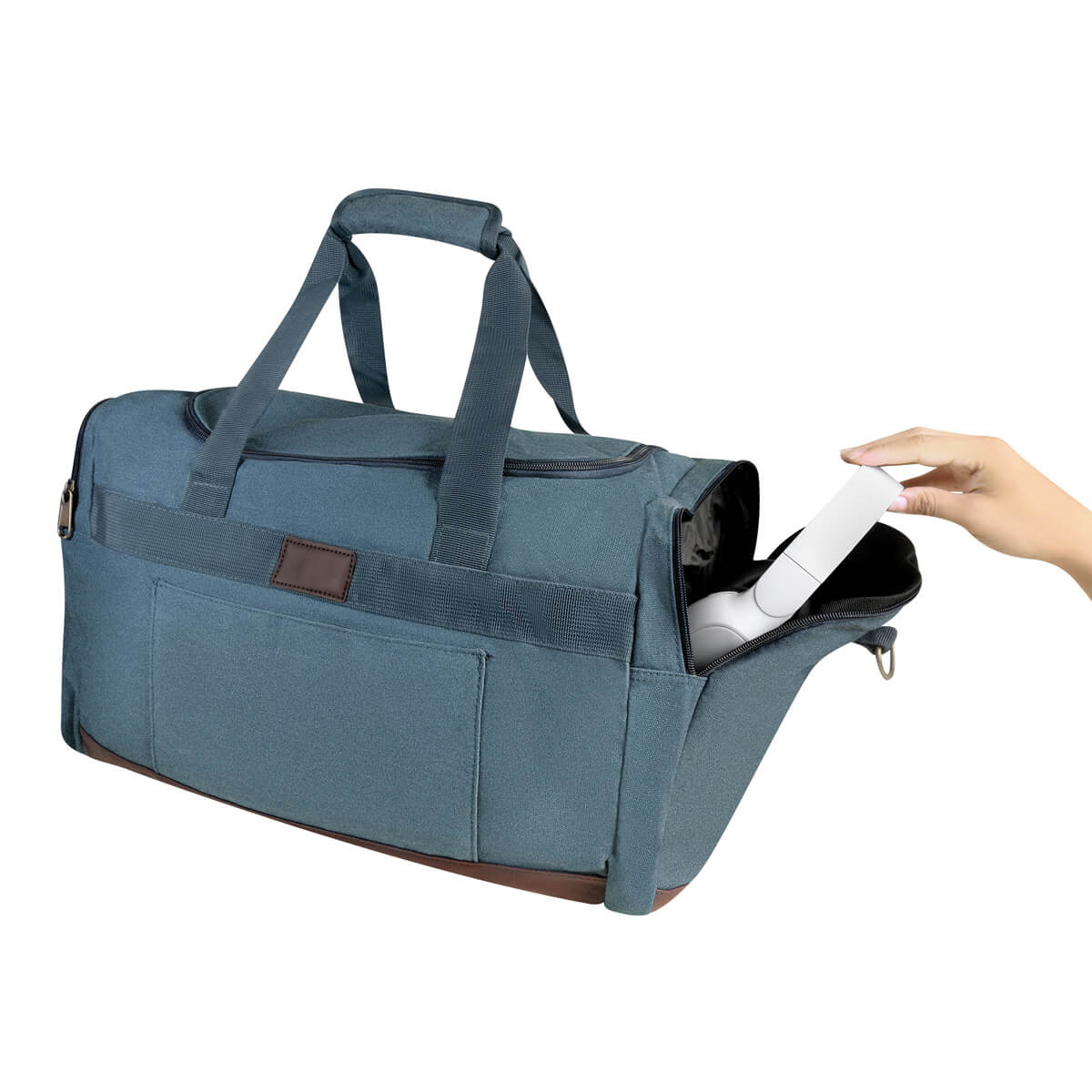 Bolsa principal y bolsas laterales con cierre, bolsillo frontal, asas y correa para hombro, ajustable y removible.