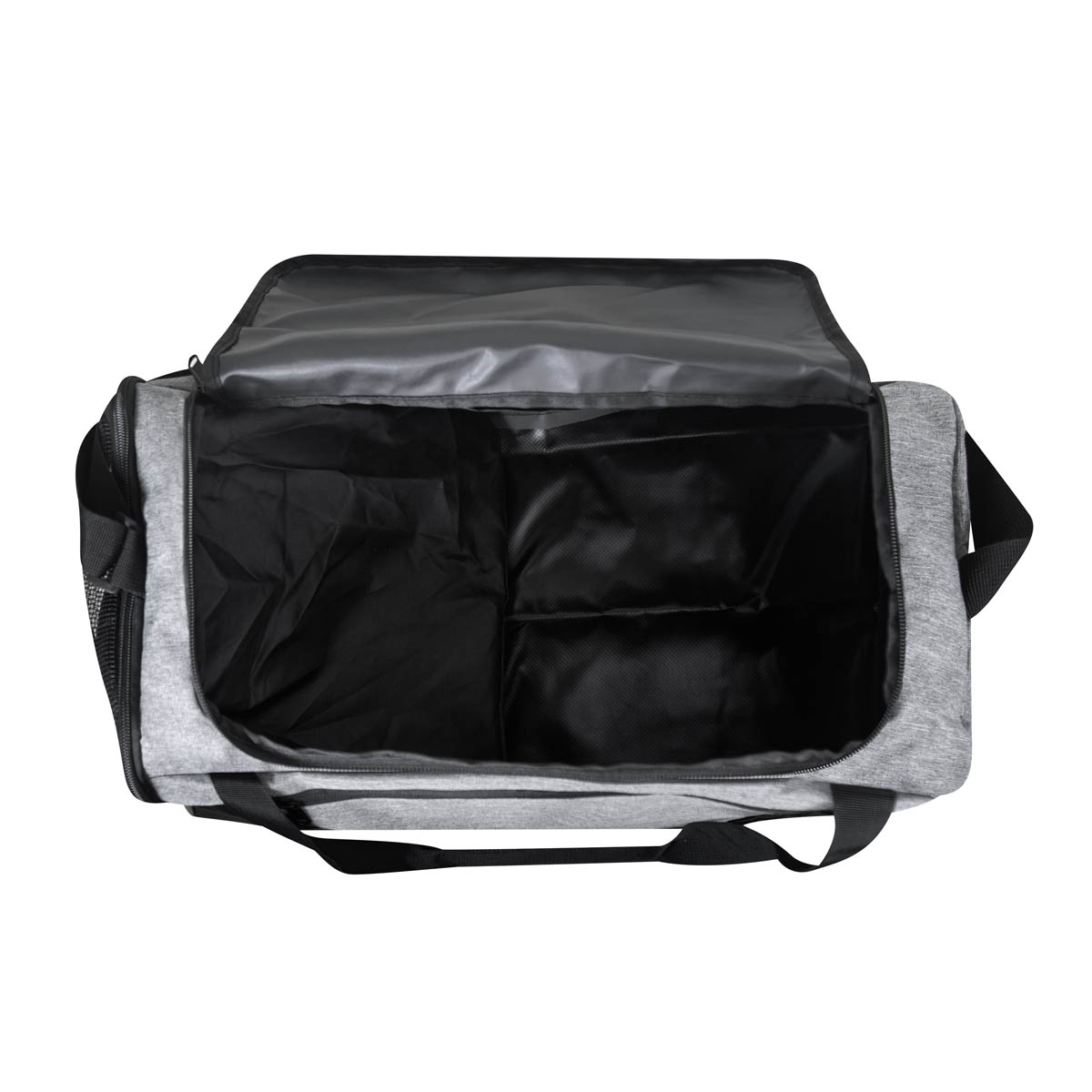 Maleta deportiva equipada con bolsa principal y una adicional en la parte frontal, ambas con cierre. Además, cuenta con un compartimento lateral para calzado y un bolsillo lateral de malla. Incluye correa ajustable para hombro y asas de agarre superior. Las costuras frontales permiten colgar objetos en ellas.