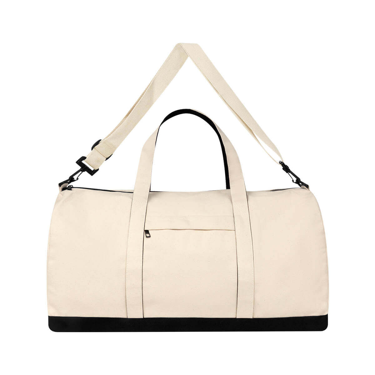 Su compartimento principal con cierre destaca por su tamaño súper amplio, perfecto para llevar todo lo necesario con comodidad. Incluye asas de mano para un fácil agarre y una práctica asa para hombro removible, sujeta con un broche de plástico para mayor seguridad. Además, cuenta con un bolsillo frontal con cierre que brinda acceso rápido a objetos pequeños o esenciales. Esta maleta ecológica está fabricada con material algodón, es la compañera ideal para viajes o escapadas de fin de semana.