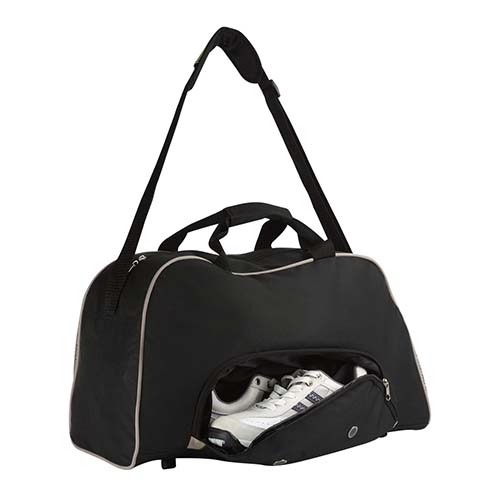 Bolsa principal con cierre, zapatera posterior con cierre, bolsa lateral de red, asas y correa para hombro ajustable.
