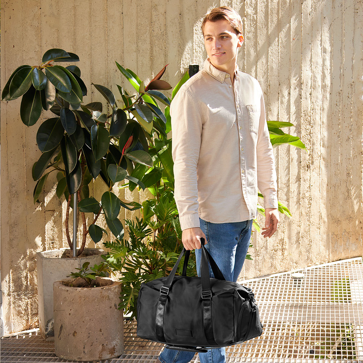 Maleta con diseño deportivo ideal para viajes o entrenamientos. Cuenta con un compartimento principal con cierre, un compartimiento interno también con cierre y otro bolsillo interno simple, para una mejor organización. Incluye un bolsillo lateral con compartimento para calzado y un bolsillo trasero con forro.