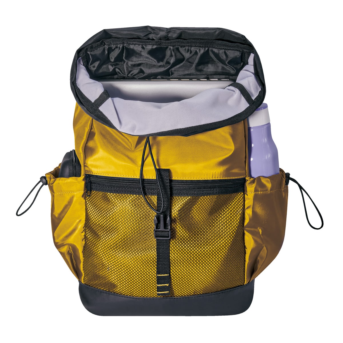 Solapa frontal con gancho y correa ajustable. Bolsa principal con cierre. Bolsa frontal de red con cierre. Compartimento para laptop de 14″. Bolsillos laterales con jareta. Tirantes ajustables y correa de agarre superior.