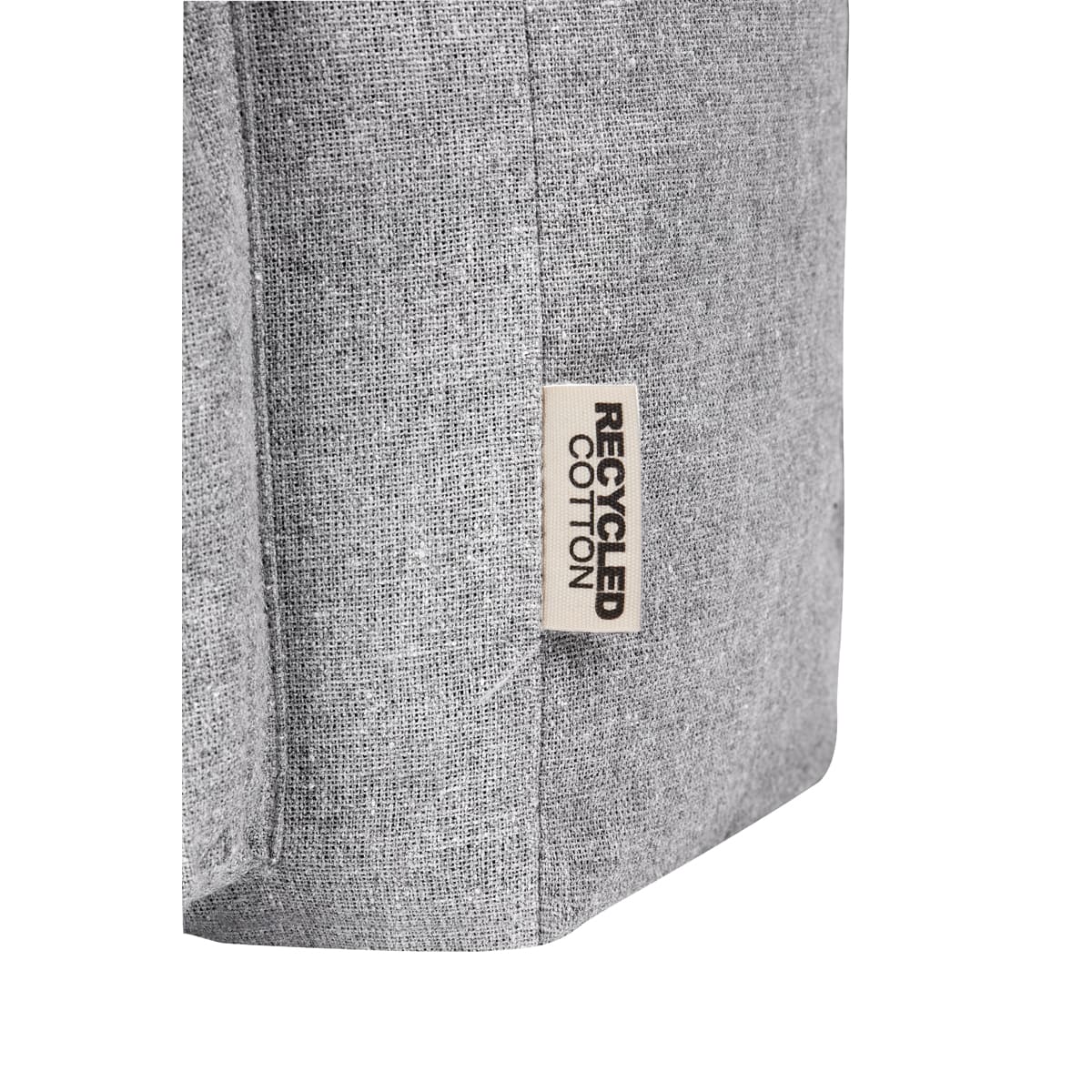 Mochila ecológica de algodón reciclado. Compartimento principal con cierre. Bolsillo frontal con velcro. Asa superior doble con broche metálico y asas para hombro ajustables.