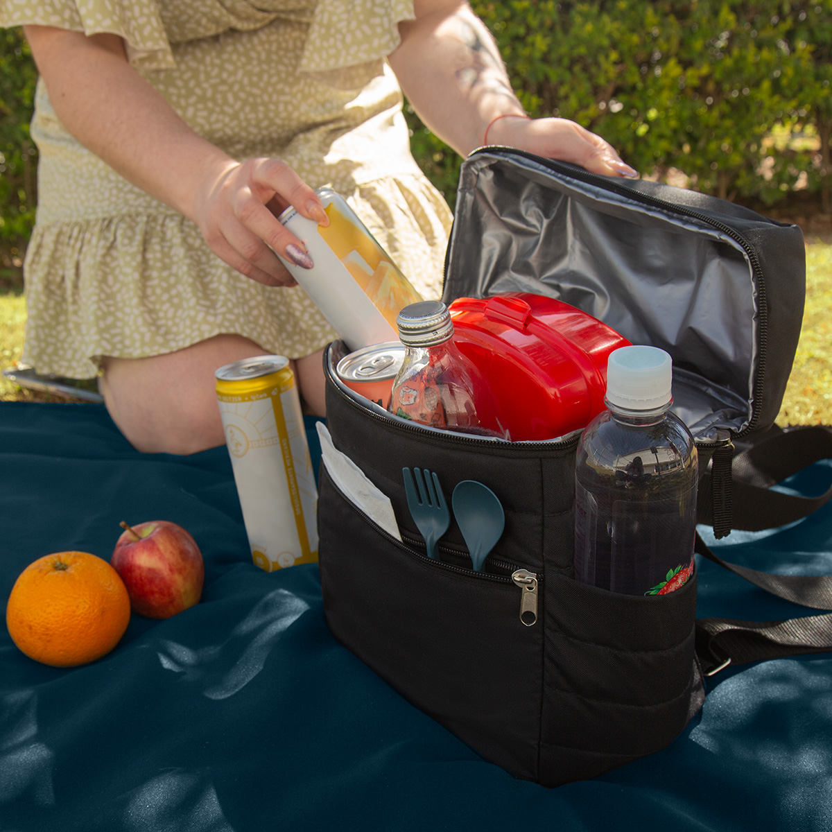 Lonchera tipo mochila con asas, su diseño versátil permite llevarla como una mochila, facilitando su transporte. Cuenta con un bolsillo principal con cierre, que permite guardar los alimentos de manera segura y organizada. Incluye un bolsillo frontal con cierre, ideal para llevar utensilios o artículos pequeños. También cuenta con dos bolsillos laterales, adecuados para llevar botellas de agua u otros objetos de acceso rápido. Capacidad para 12 latas.