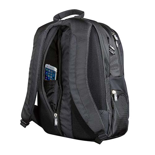 Bolsa principal con cierre y espacio para laptop de 15”. Bolsa central para tablet. Bolsa frontal con compartimentos para celular, bolígrafos y documentos. Bolsas laterales con cierre. Respaldo con cierre y porta celular interno. Respaldo y tirantes acojinados. Compartimento inferior con funda impermeable para la mochila. Incluye porta llaves.