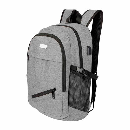 Mochila con salida USB (se requiere conectar a batería portátil) para cargar smartphone. Bolsa principal con espacio para laptop de 17″ y tablet. Bolsa frontal con organizador y 2 bolsas frontales con cierre. 2 Bolsas laterales de red con broches ajustables de plástico. Salida para audífonos. Aditamento especial trasero para poner en trolley. Placa metálica removible para fácil grabado. Respaldo y tirantes acojinados.