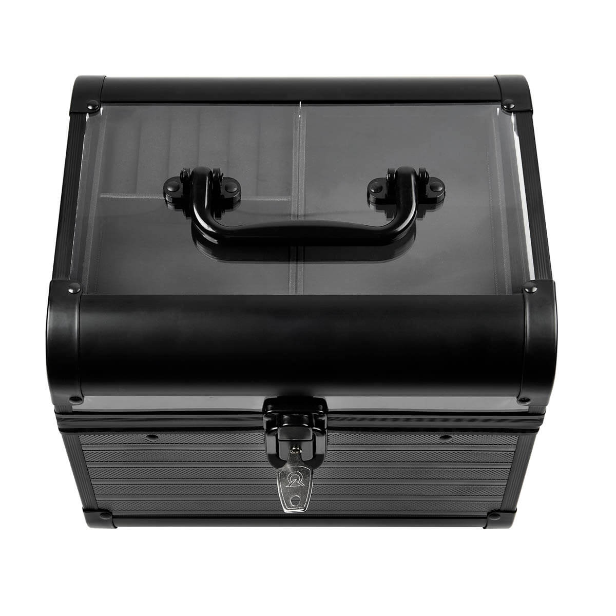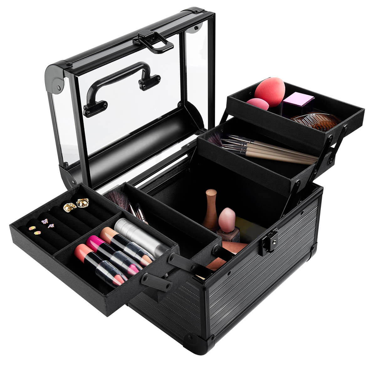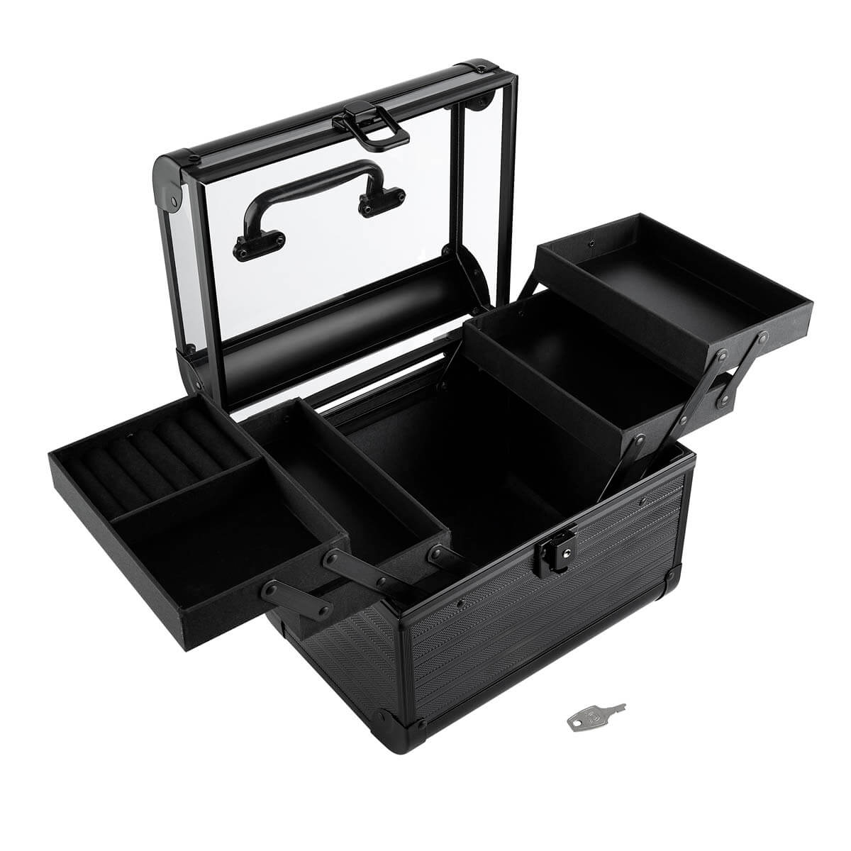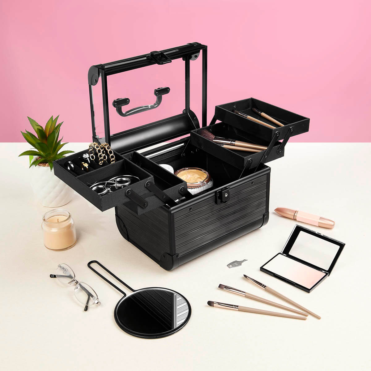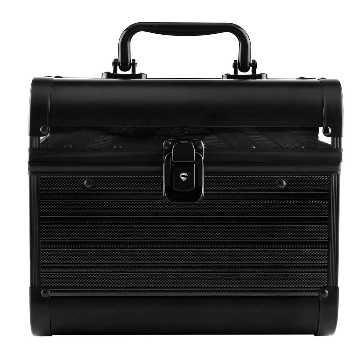 Neceser maletín multifuncional reforzado. Organiza todos tus productos de belleza de manera eficiente. Gracias a su diseño expandible, incluye 4 charolas; una especial para joyería. Cierre con broche metálico, incorpora una cerradura con llave para mantener el acceso controlado. Asa superior para utilizarla en casa o para viajar.