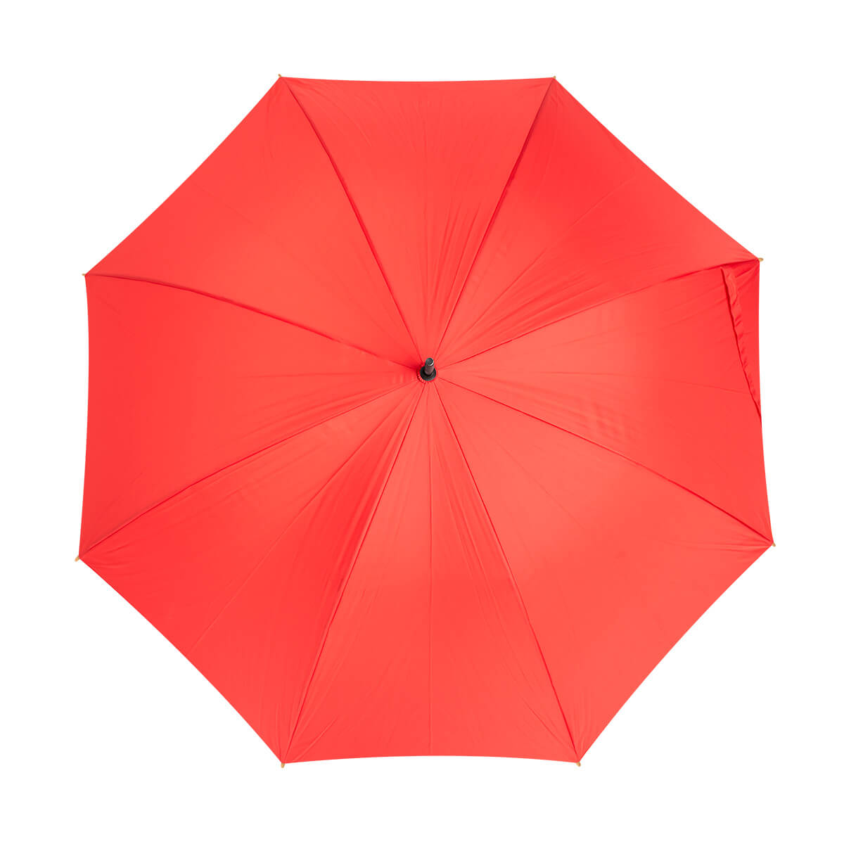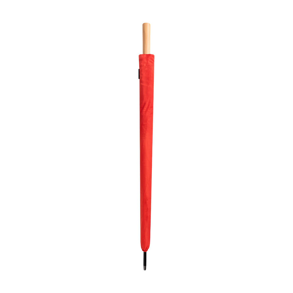 Paraguas de 8 paneles con apertura automática. fabricado en plástico reciclado (RPET). Cuenta con mango y punteras de madera. Incluye funda protectora.